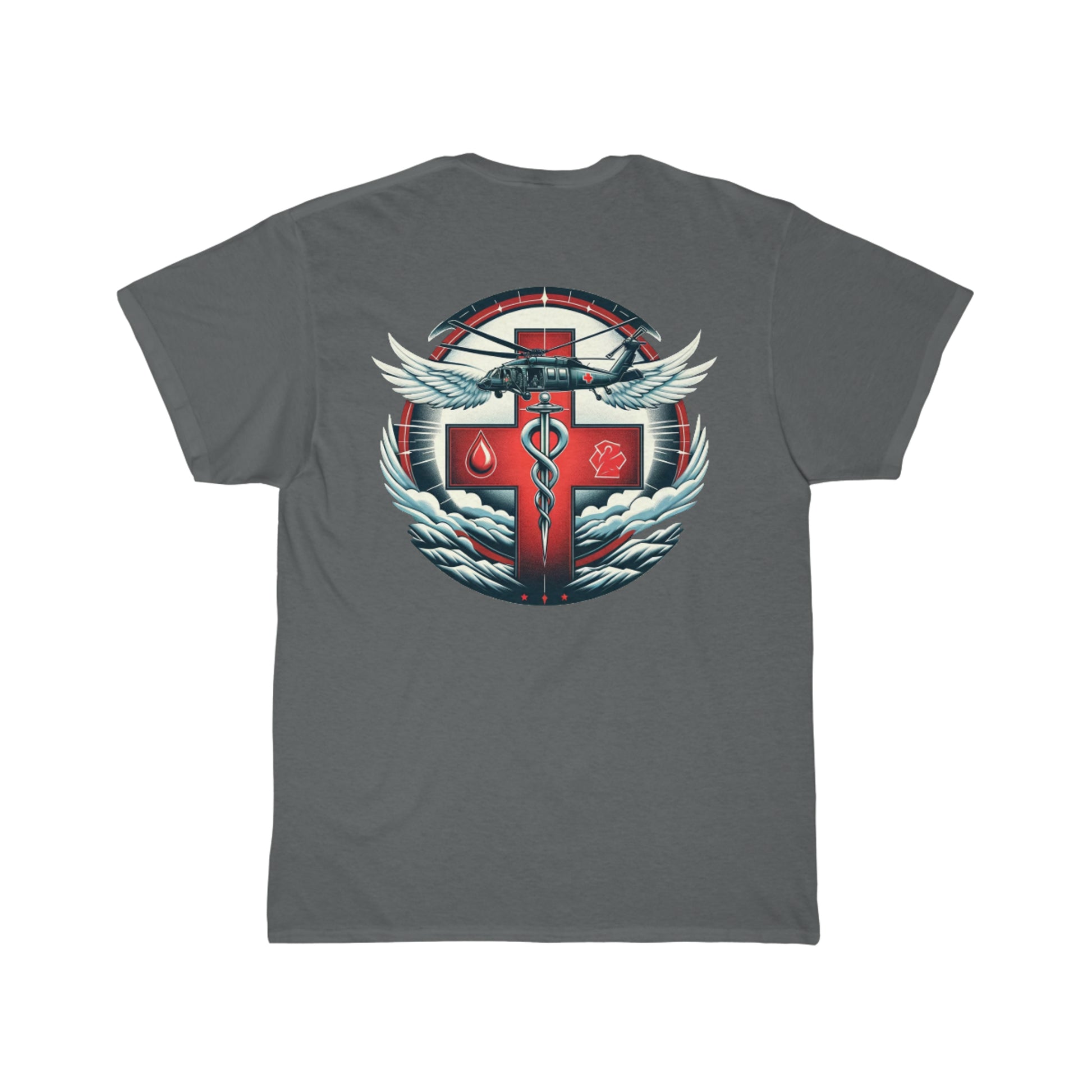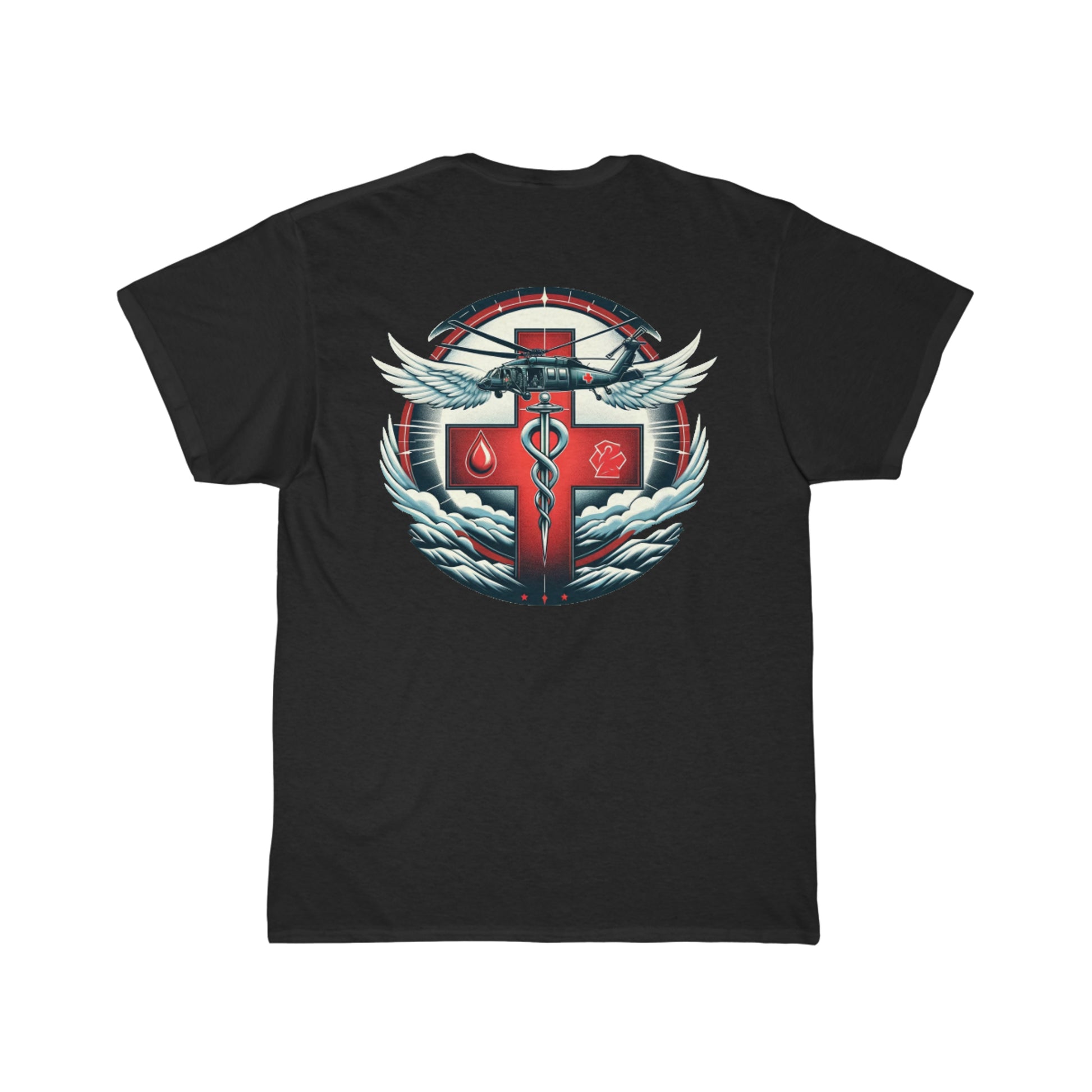 Center stage, a bold red cross anchors the tee, a universal beacon of medical aid and relief. Hovering protectively above is the noble figure of a military medivac helicopter, its rotors transformed into heavenly wings—a fitting depiction of the life-saving missions these aircraft perform.