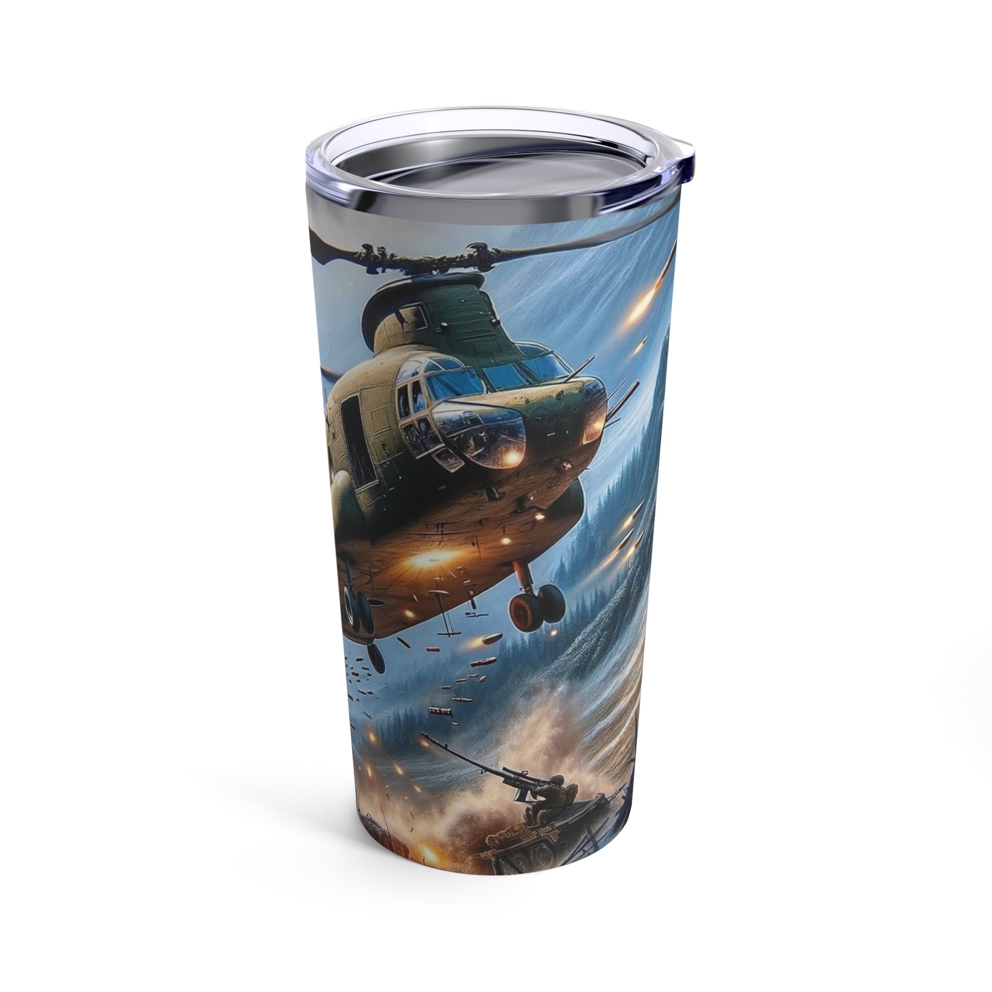 But let's pause the action for a sec – because even heroes need to hydrate, right? Imagine taking a power sip and feeling as invincible as the soldiers on the ground or as unstoppable as the helicopter blades cutting through the air. This tumbler doesn’t just hold your drink; it holds the essence of bravery, endurance, and maybe a little bit of that "I can conquer anything" vibe (especially before your morning coffee). ☕🚁