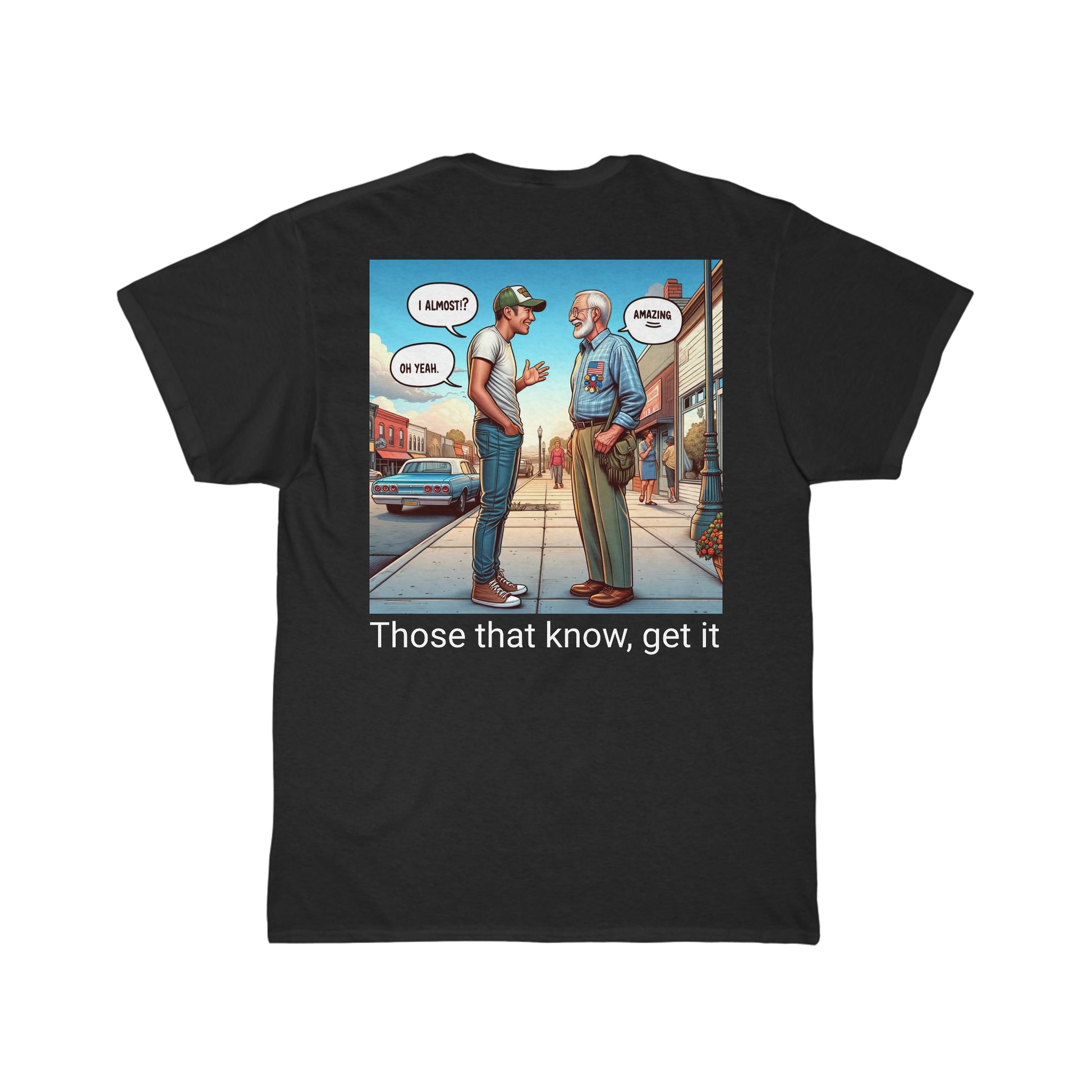 Dropping now is a t-shirt that bridges generations with a single statement. Picture this: a young buck, full of swagger, leans in to share a tale of a near-feat with a seasoned military vet, whose expression says, "I've been there, done that, and got the t-shirt." Well, folks, this is that t-shirt!