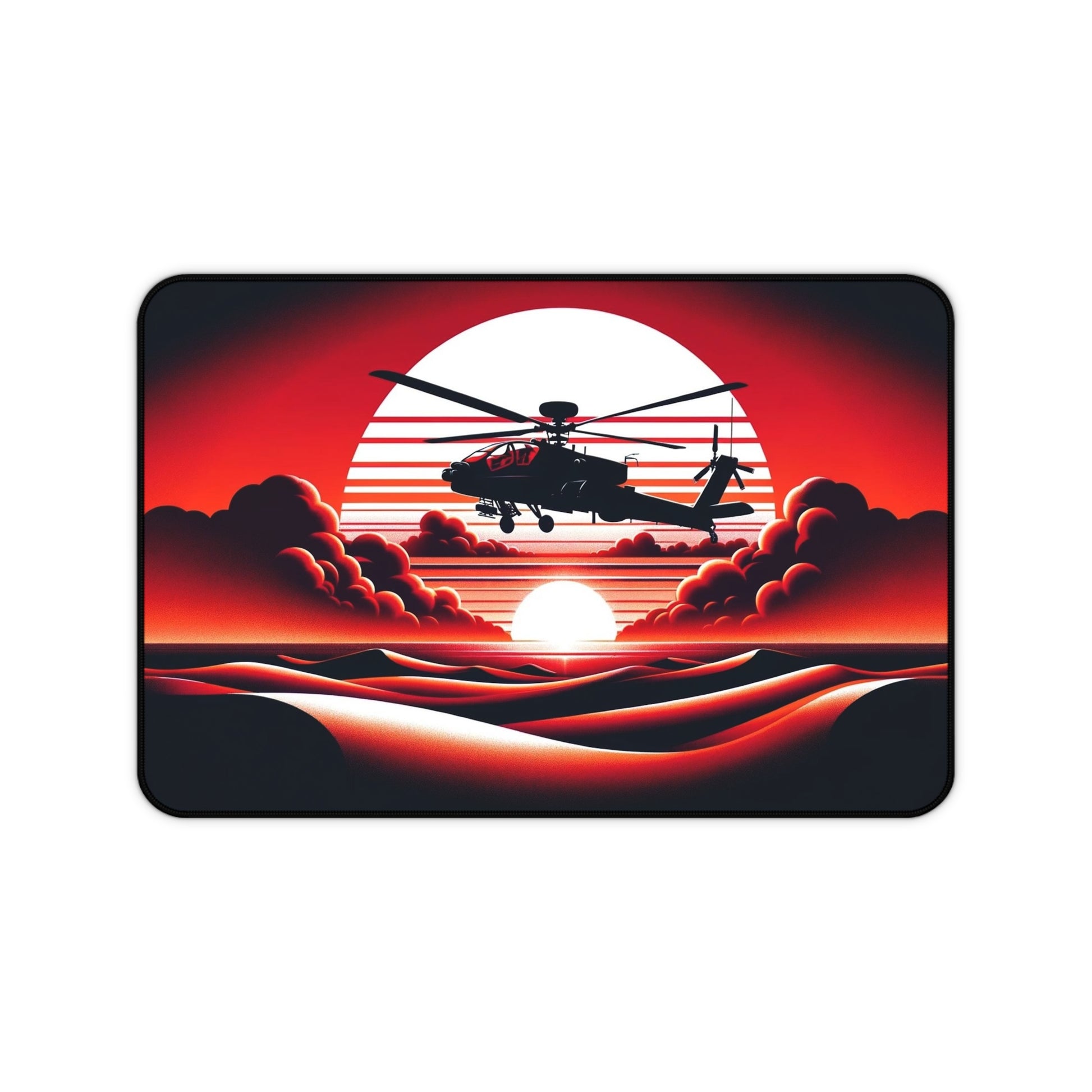 Soar into the endless possibilities of your workday with a design that's as daring as it is mesmerizing. Featuring a formidable military chopper taking center stage, the "Crimson Flight" captures the essence of adventure and the relentless spirit of those who dare to aim higher. With the majestic setting sun casting a radiant backdrop, the scene is a vivid dance of reds and blacks, echoing the fiery passion of those who blaze their trails.