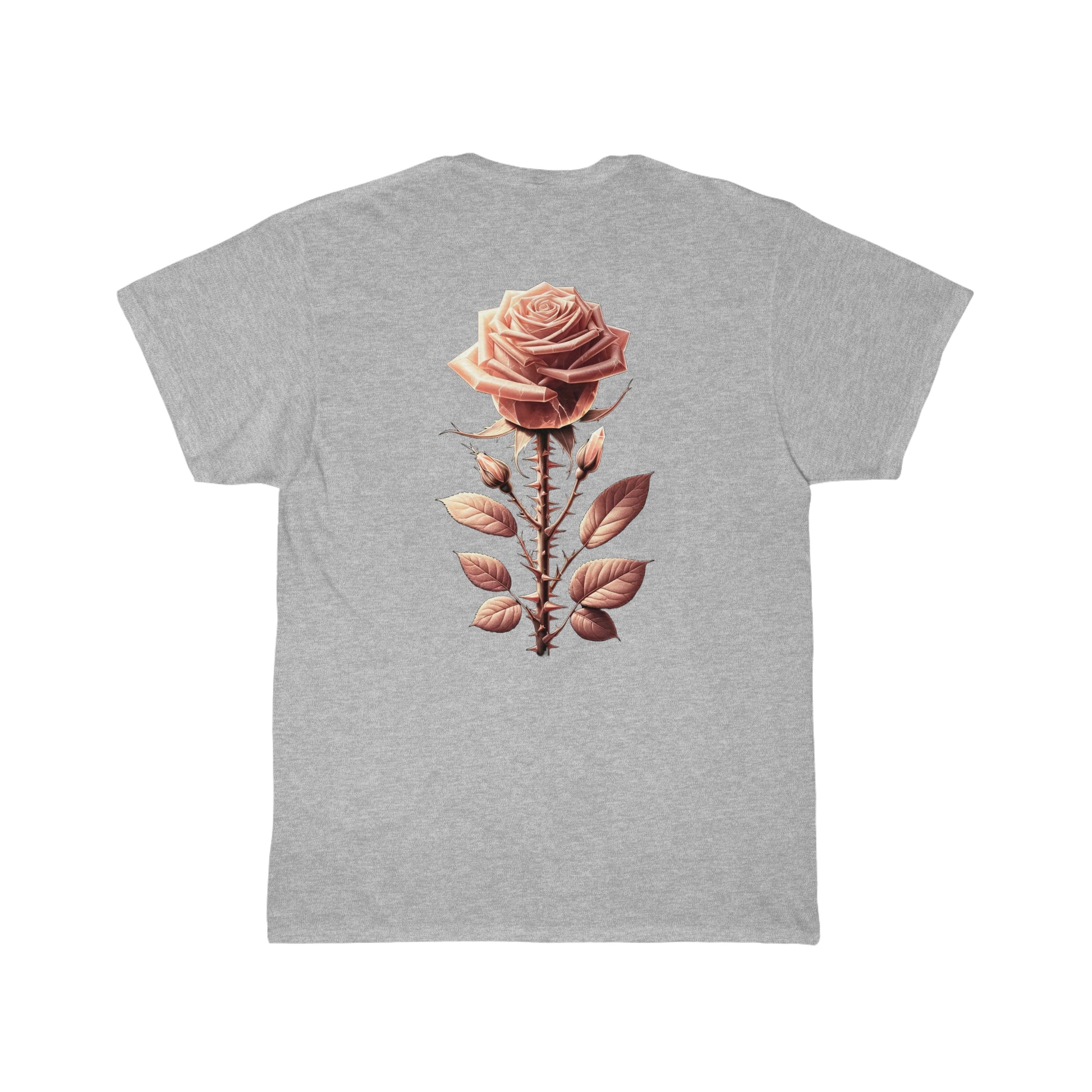 Center stage on this shirt is a stunningly detailed, pale pink rose in full bloom. Its petals open gracefully, inviting admiration for each intricately drawn line, capturing the flower's delicate essence. But that's not all—the beauty of this rose is more than skin deep.