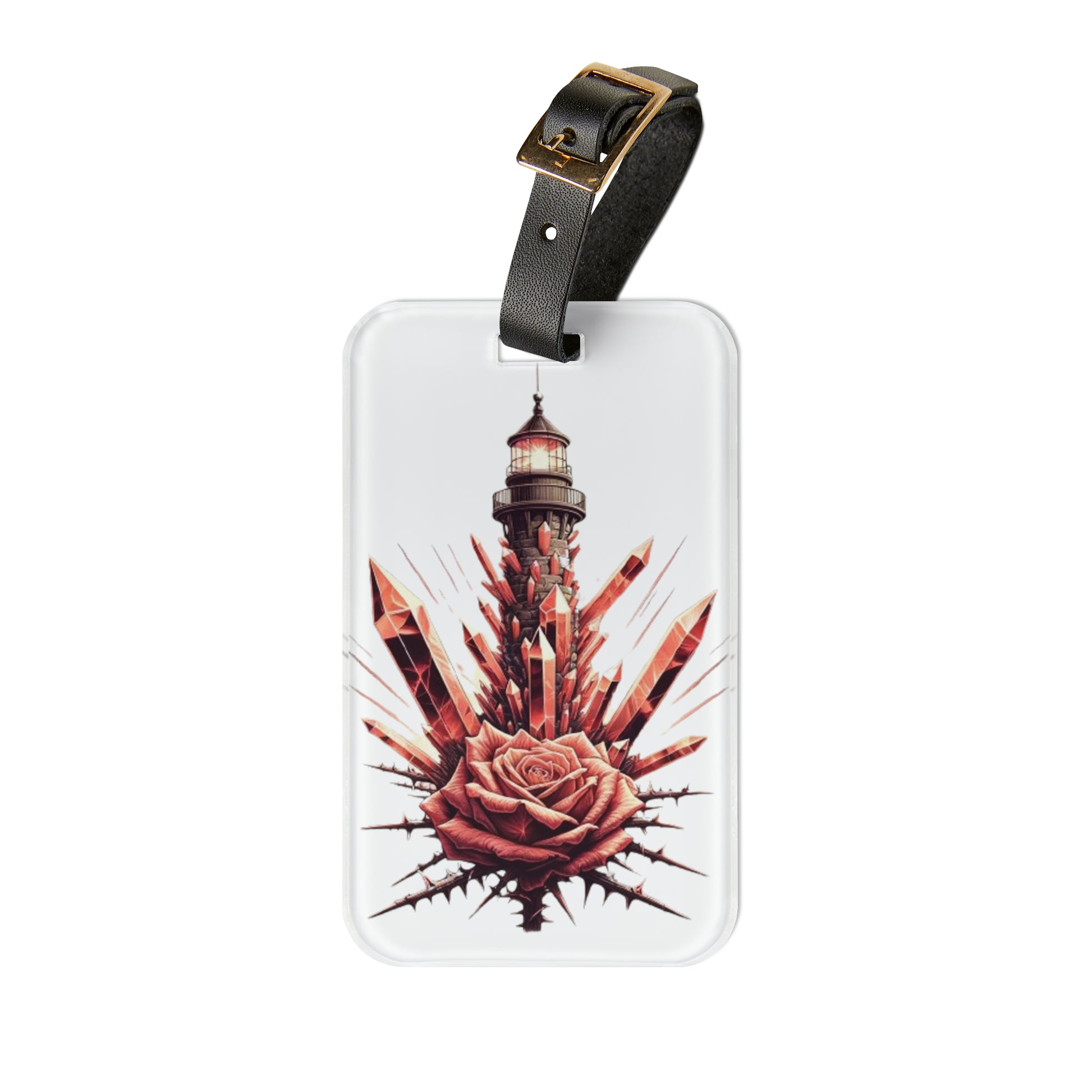 Design: One side of this exquisite piece features a unique, artistically rendered lighthouse, standing majestic and unyielding. But this is no ordinary lighthouse—it's surrounded by and impaled with a dazzling array of pink crystals, shimmering with potential and guiding the way to your next big adventure. At the bottom center, a solitary pink rose blooms, adding a touch of natural beauty and serenity to the dynamic scene. The entire design is set against a glossy finish, ensuring your tag catches the light—and the eyes of fellow travelers.