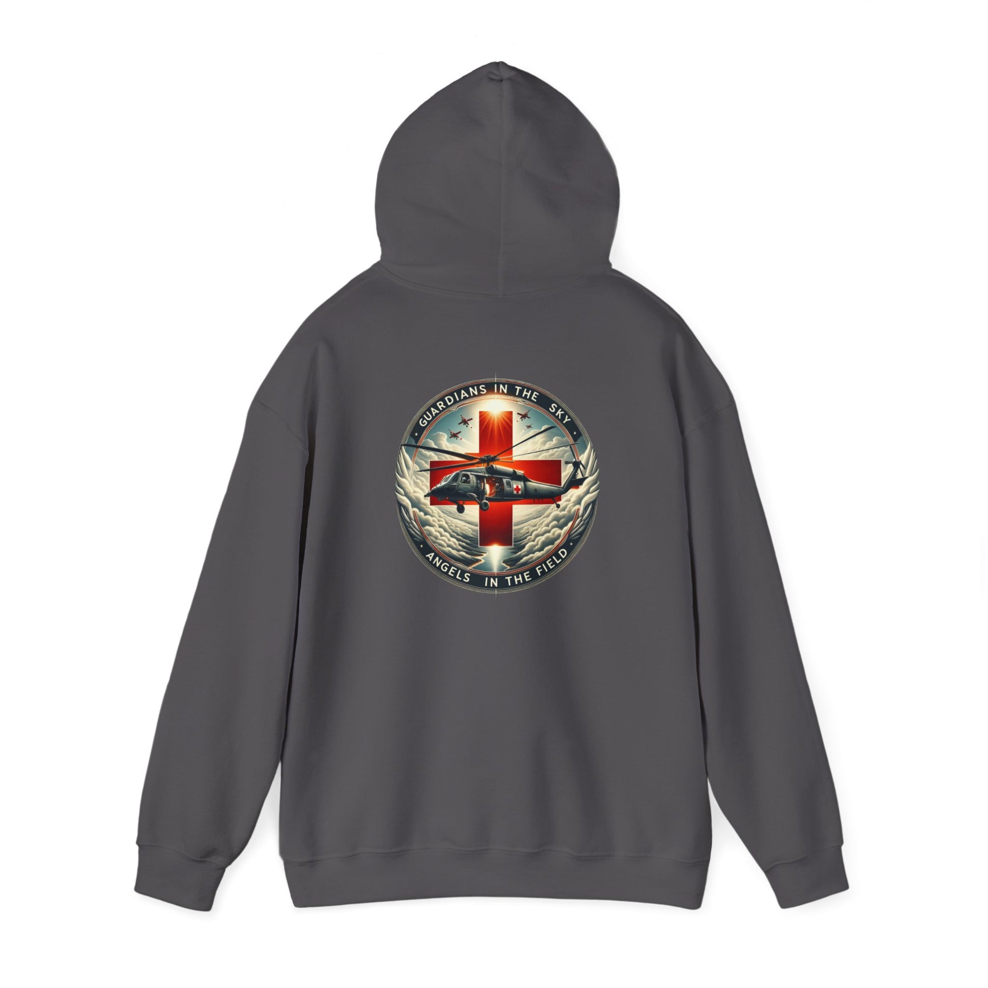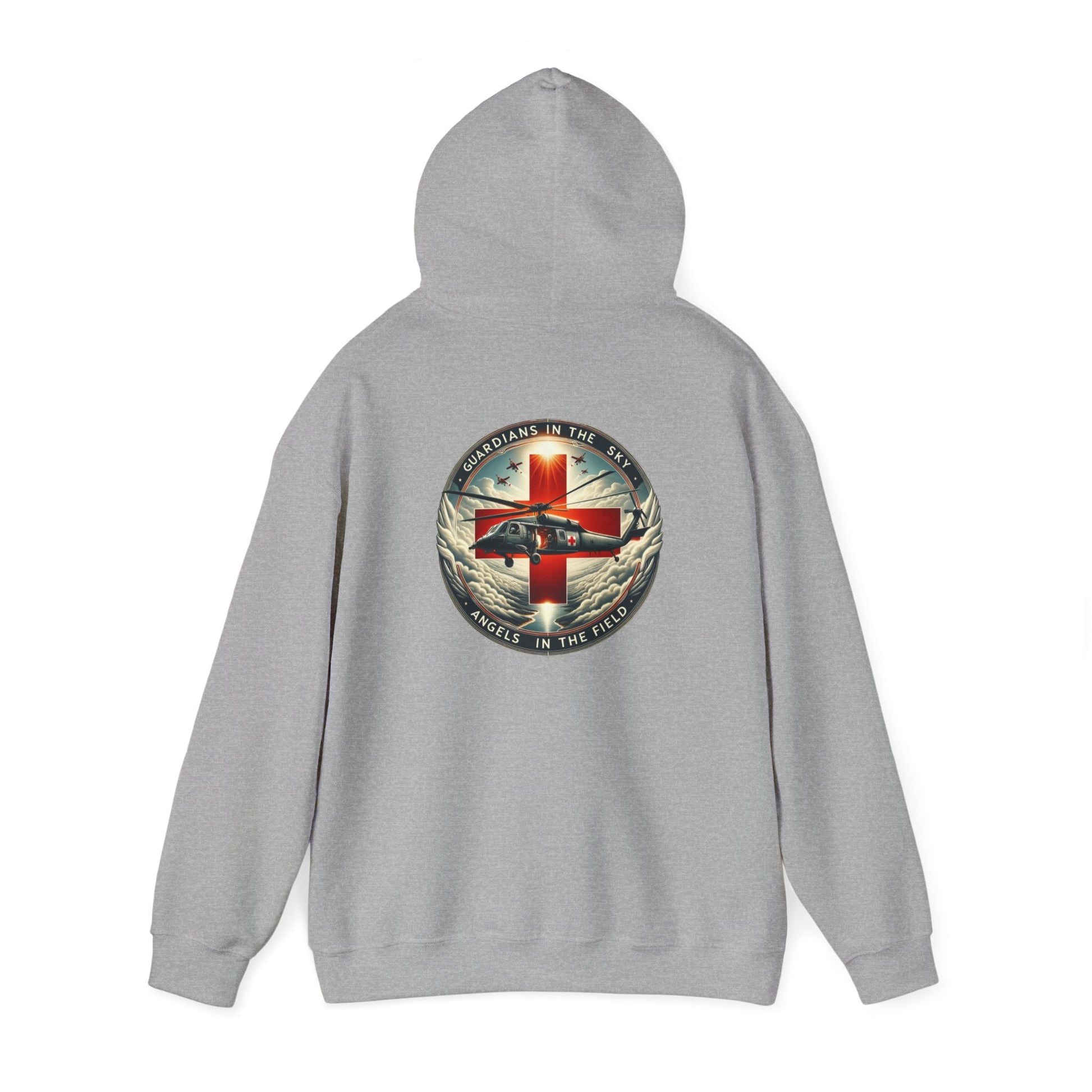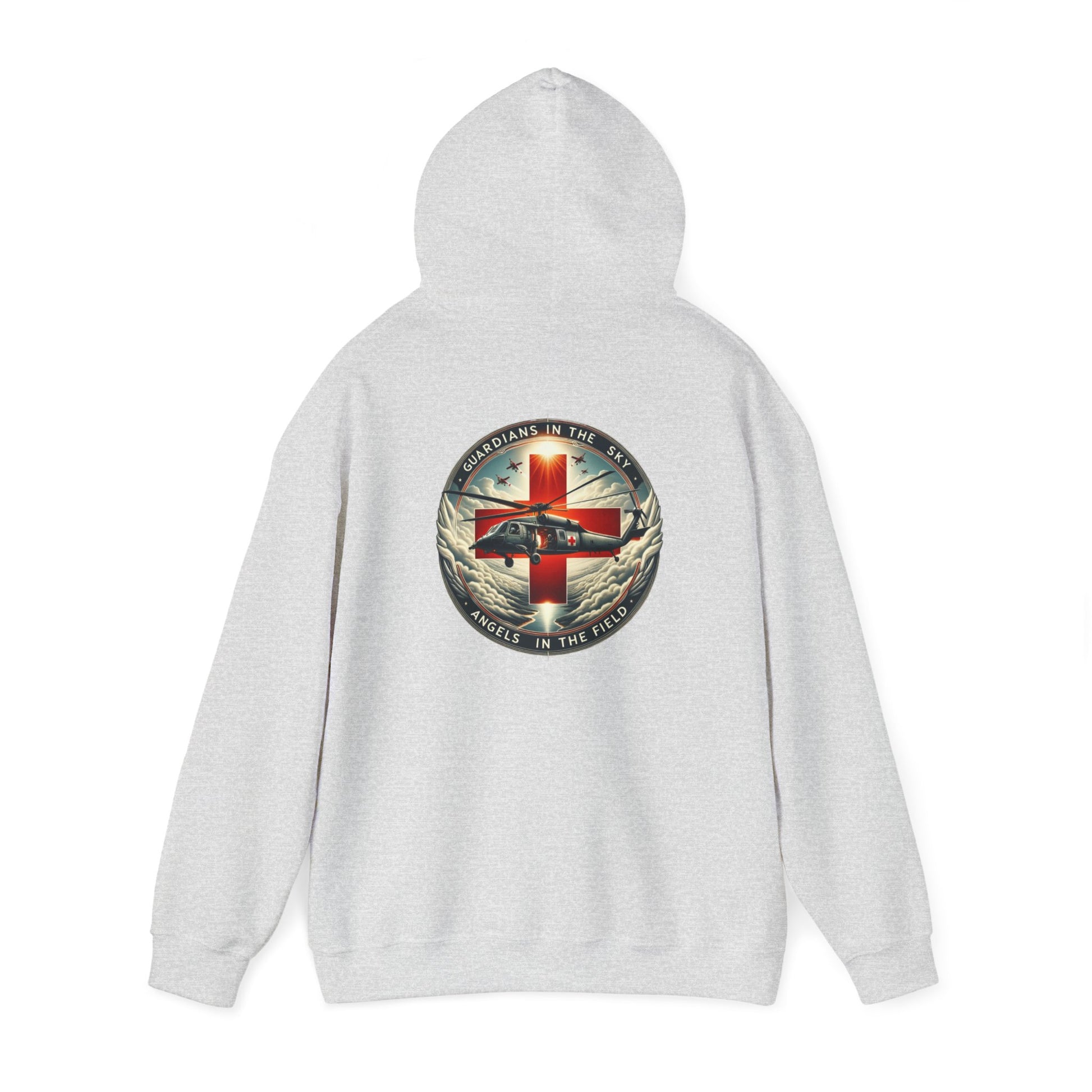 The back of the sweatshirt showcases a poignant, awe-inspiring design; a medivac helicopter, the chariot of the skies, hovers valiantly above a river it parts with the winds of urgency, all emblazoned in front of a resolute red cross — the universal emblem of aid and hope. This striking image captures the essence of life-saving missions and the fearless hearts who undertake them.