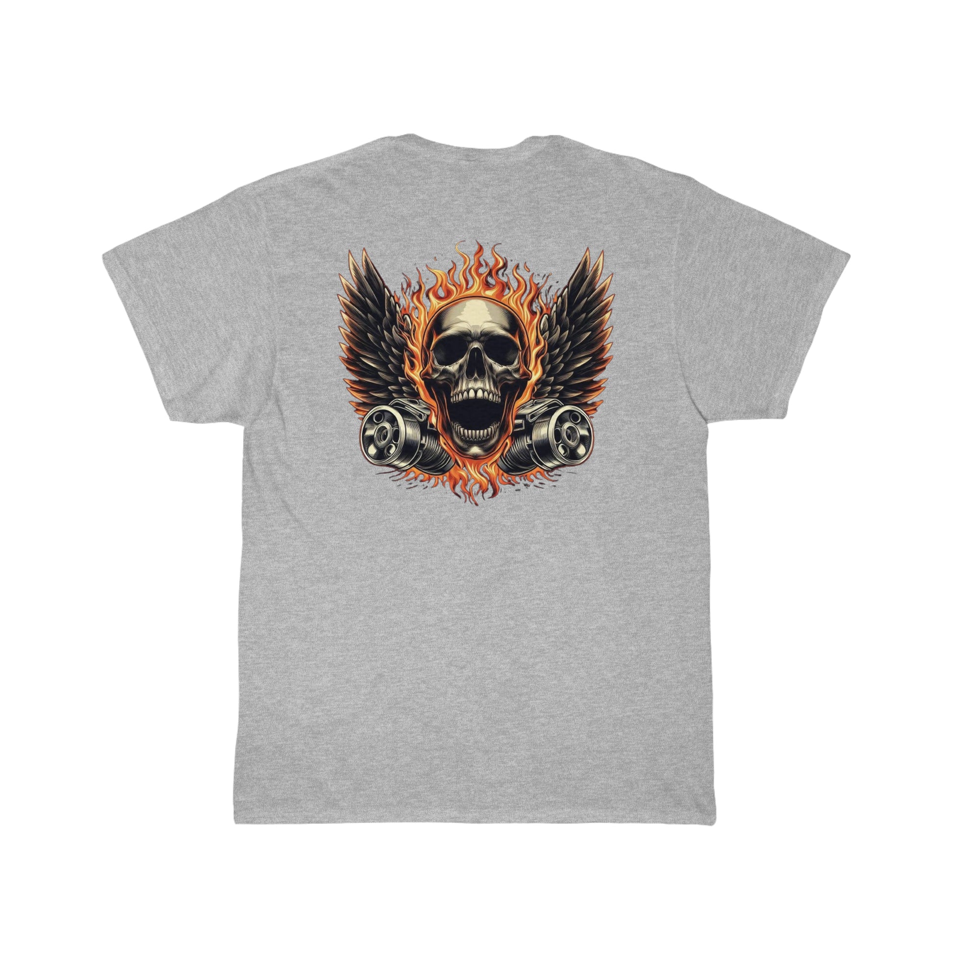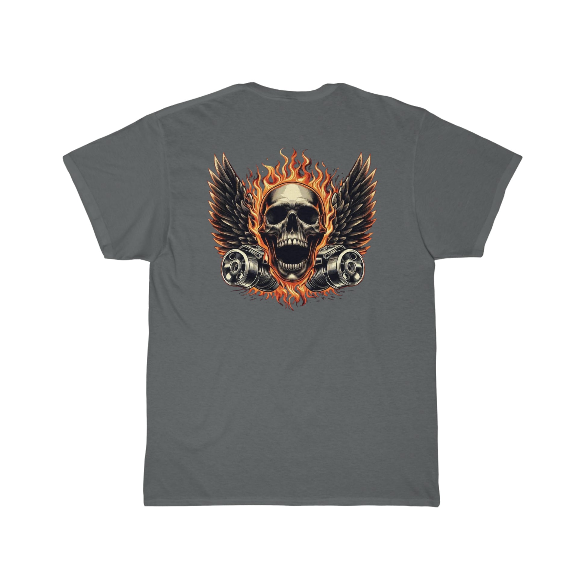 Ignite your gearhead soul with the "Mechanical Seraph" T-Shirt; a fiery fusion of mechanics and myth. At its heart, a striking skeleton head stares out, encapsulating the eternal love affair with the road and machine. Bursting from its temples, majestic wings span wide in a symbol of freedom and raw power.