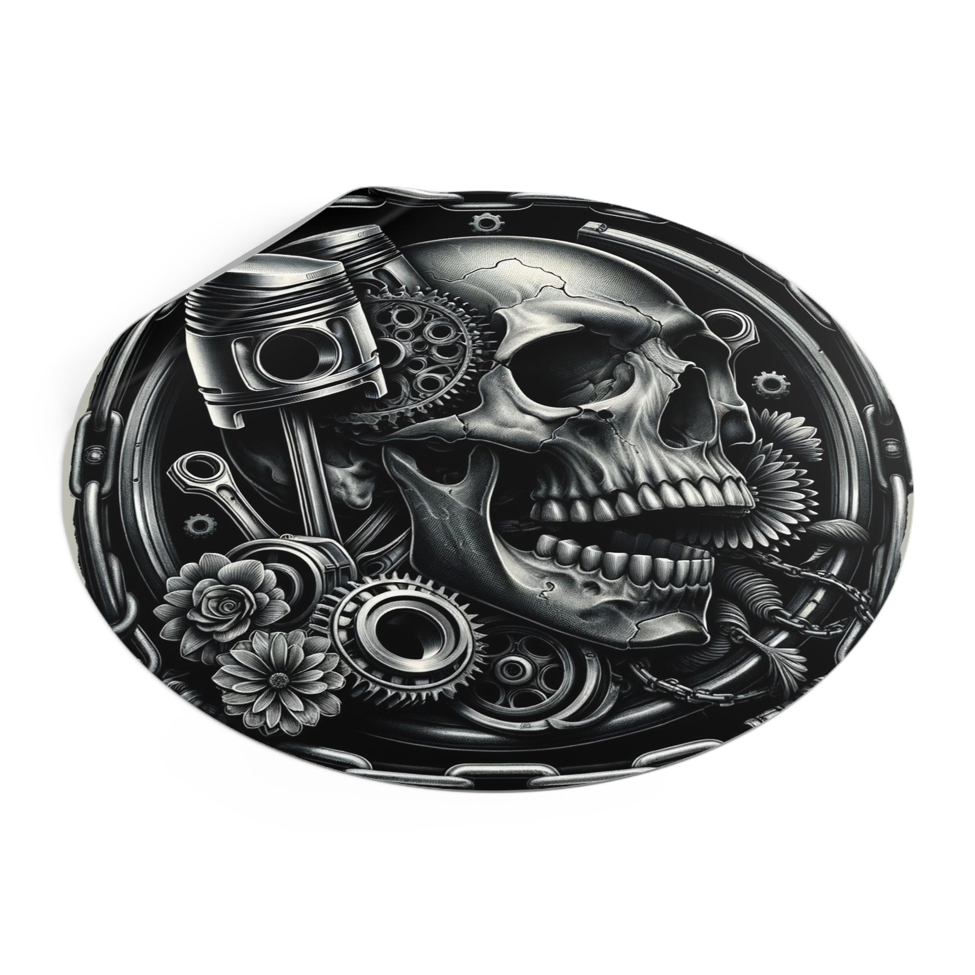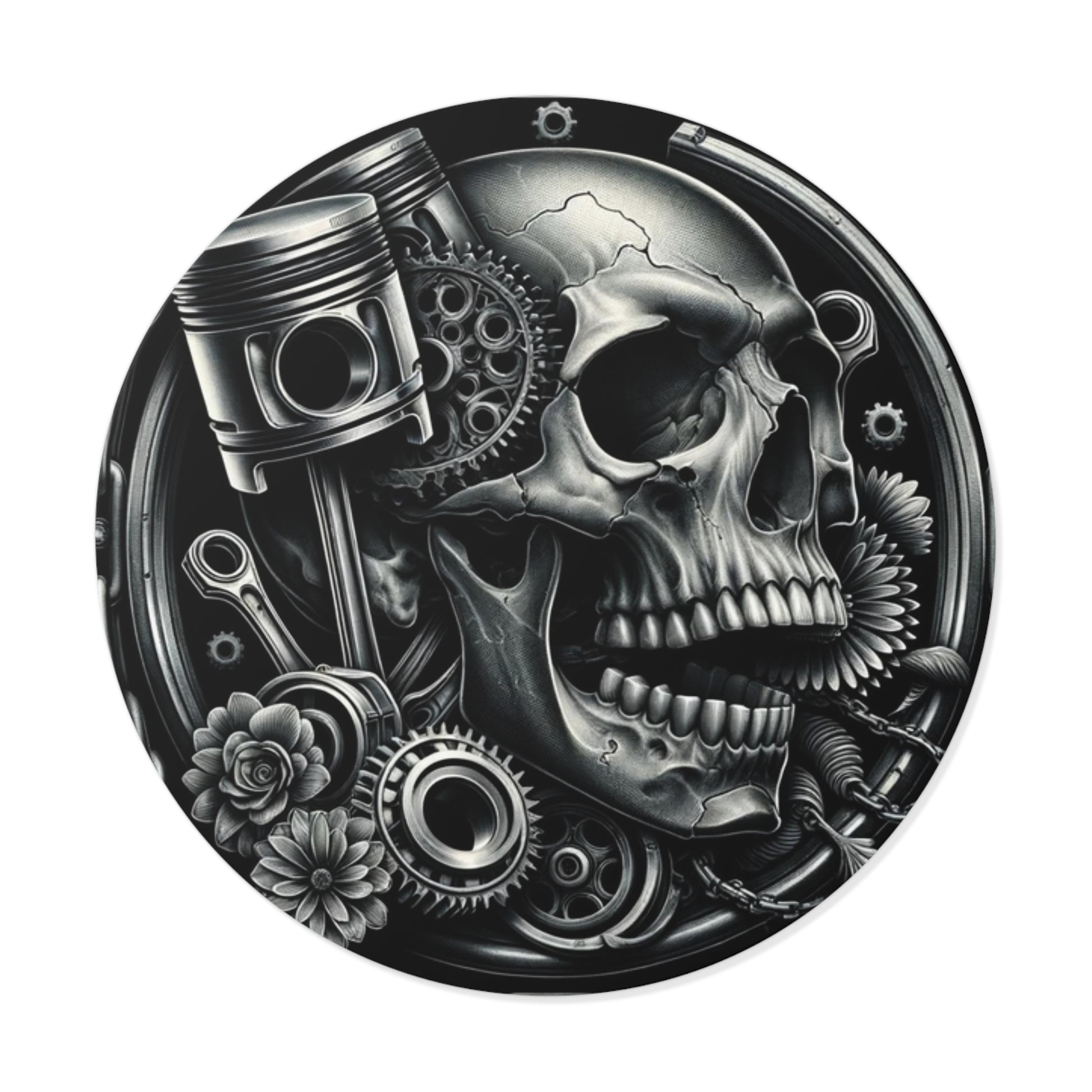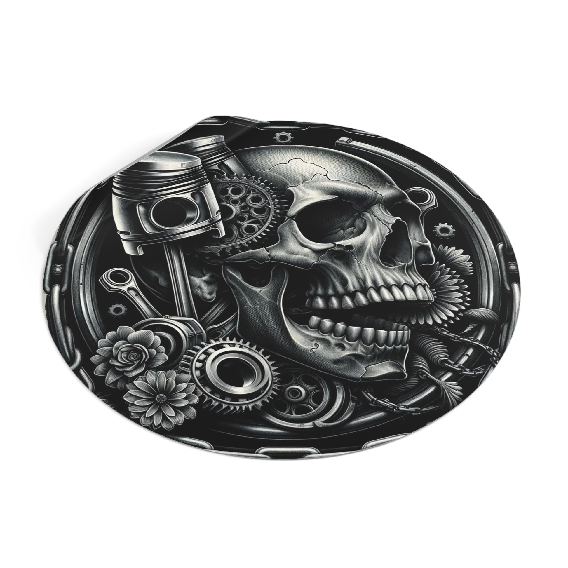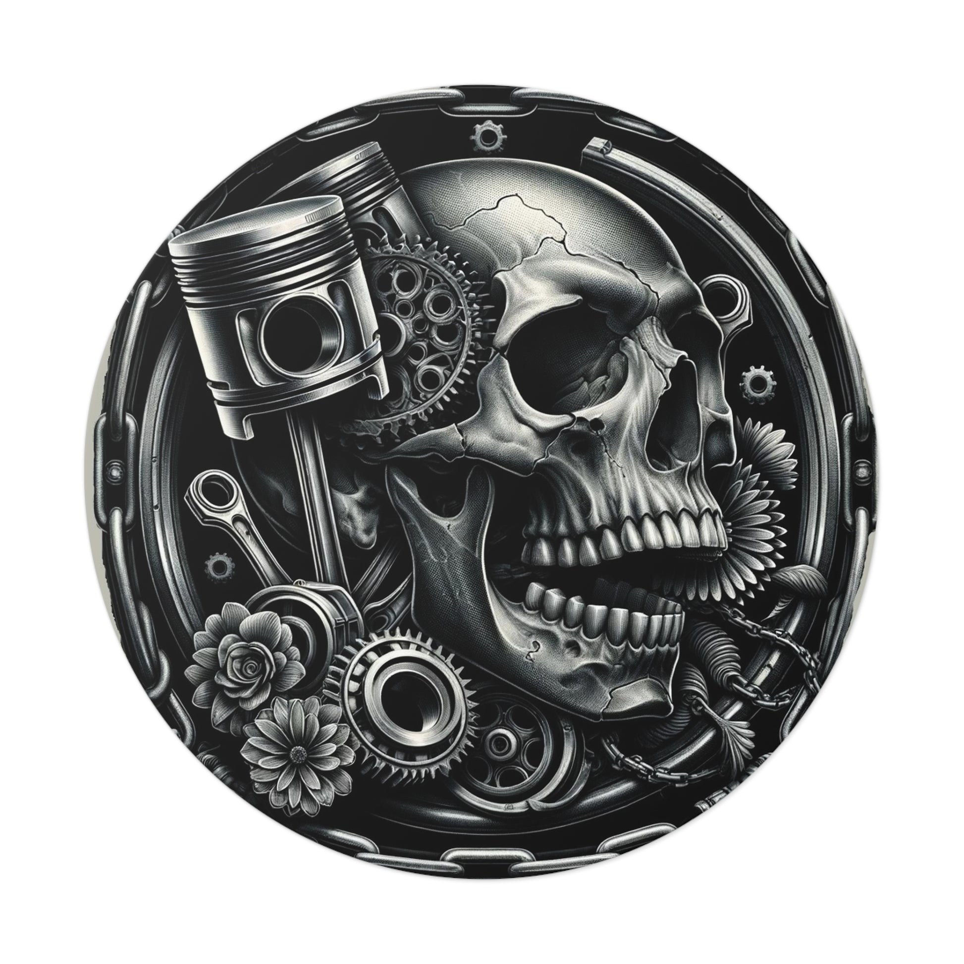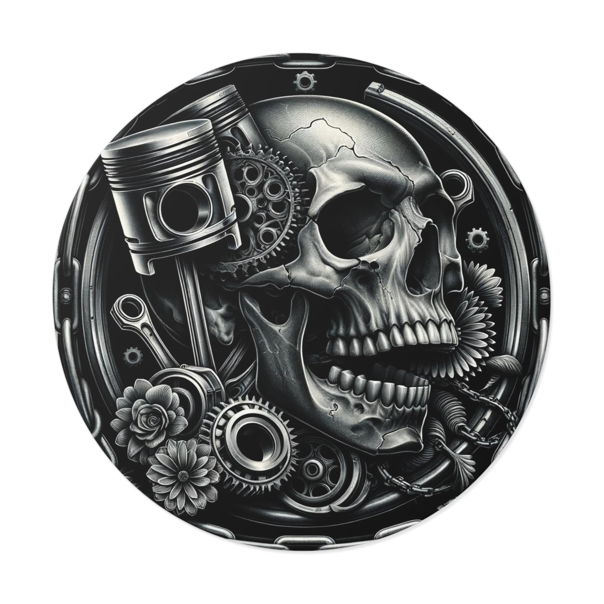 The centerpiece is a defiant skull, symbolizing the grit and tenacity of mechanics who bring machines to life. Encircling this are the trusted icons of the trade—wrenches, gears, pistons, and more—each item depicted with intricate attention to detail, resonating with the familiar feel of the garage.