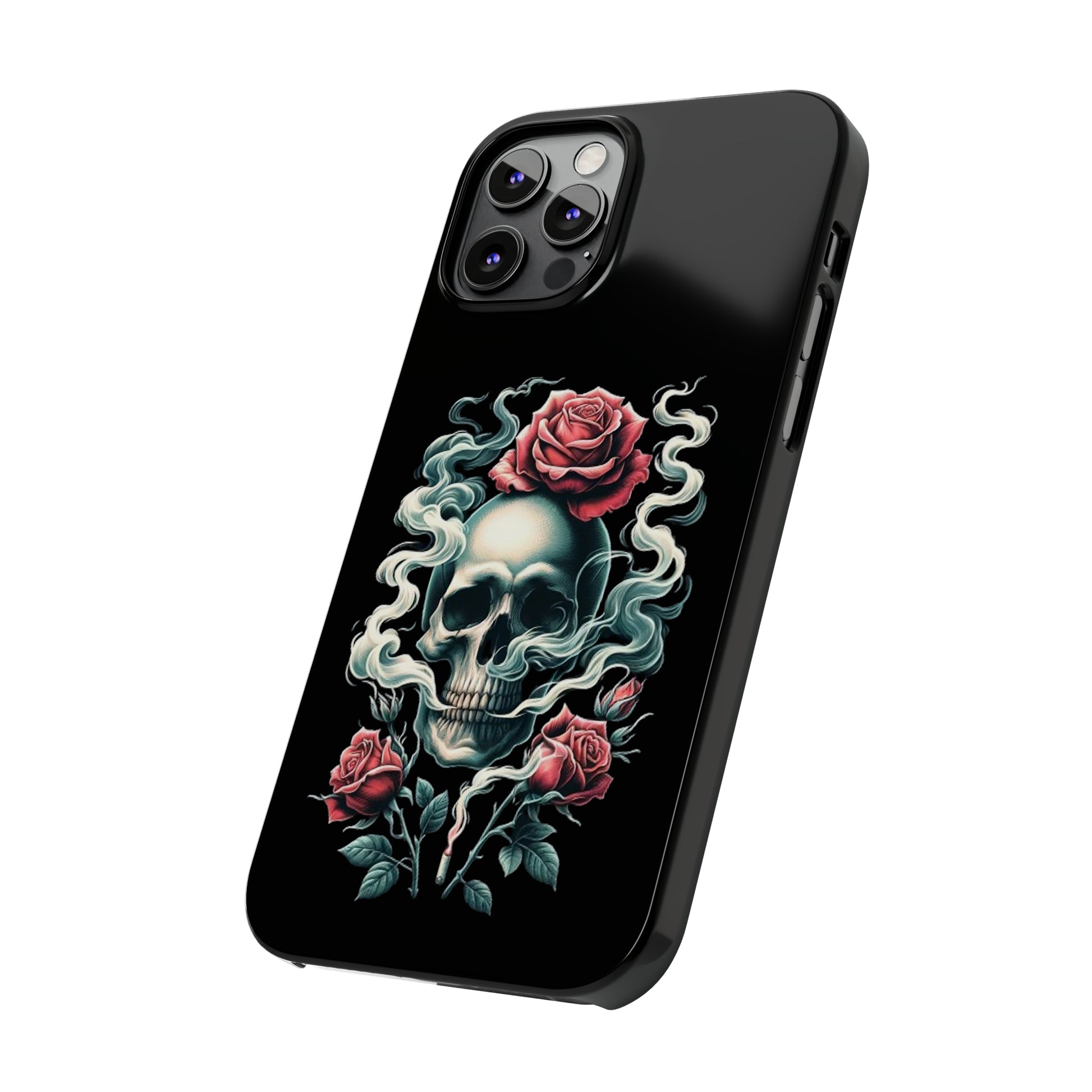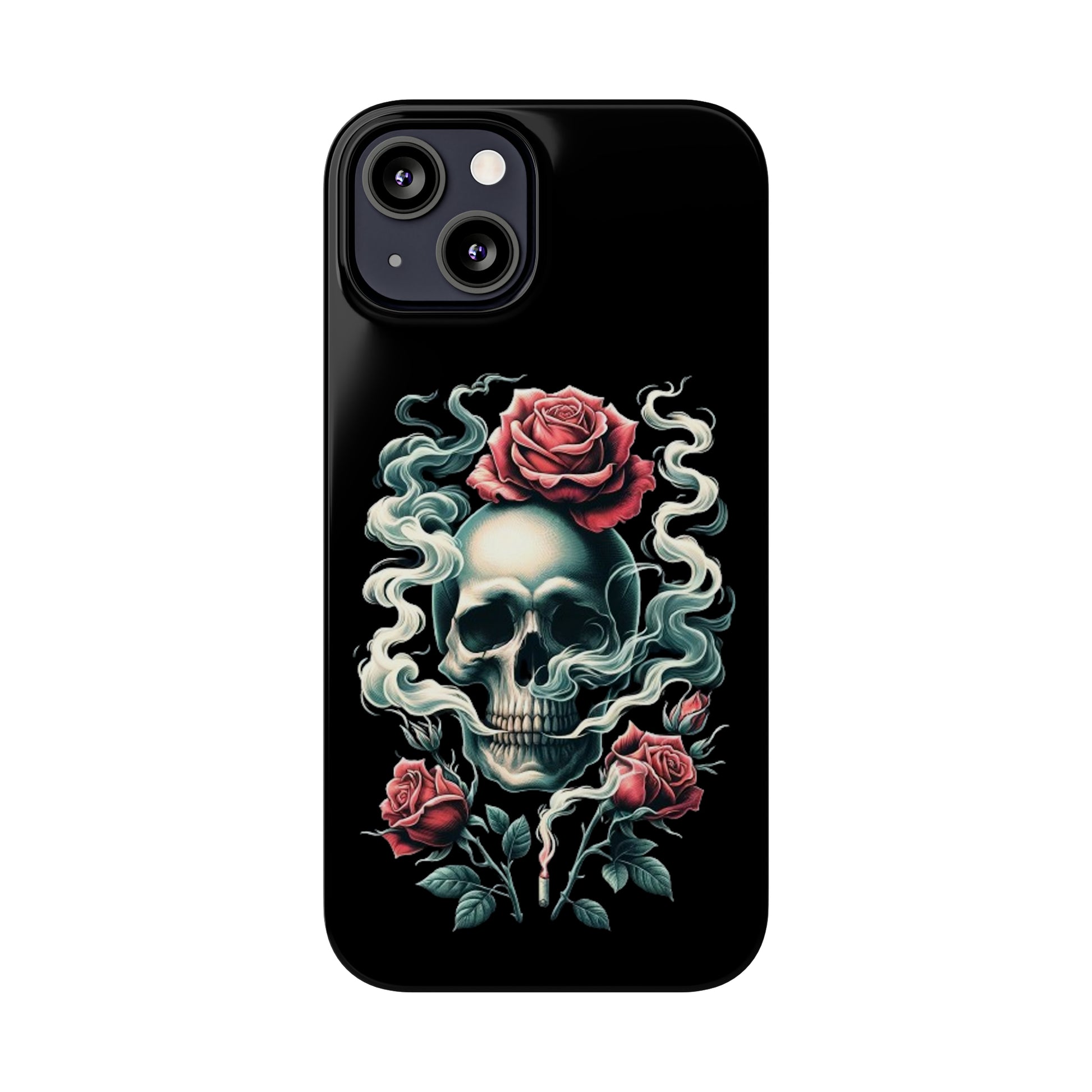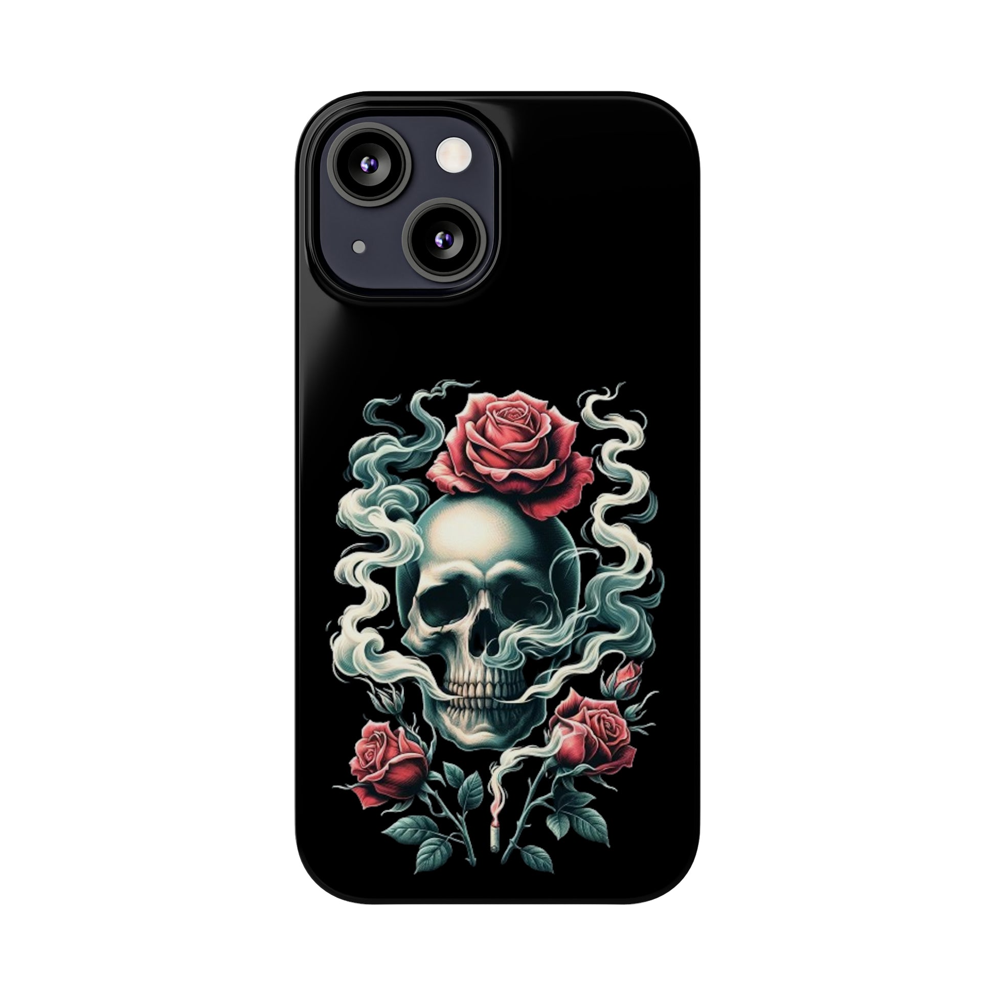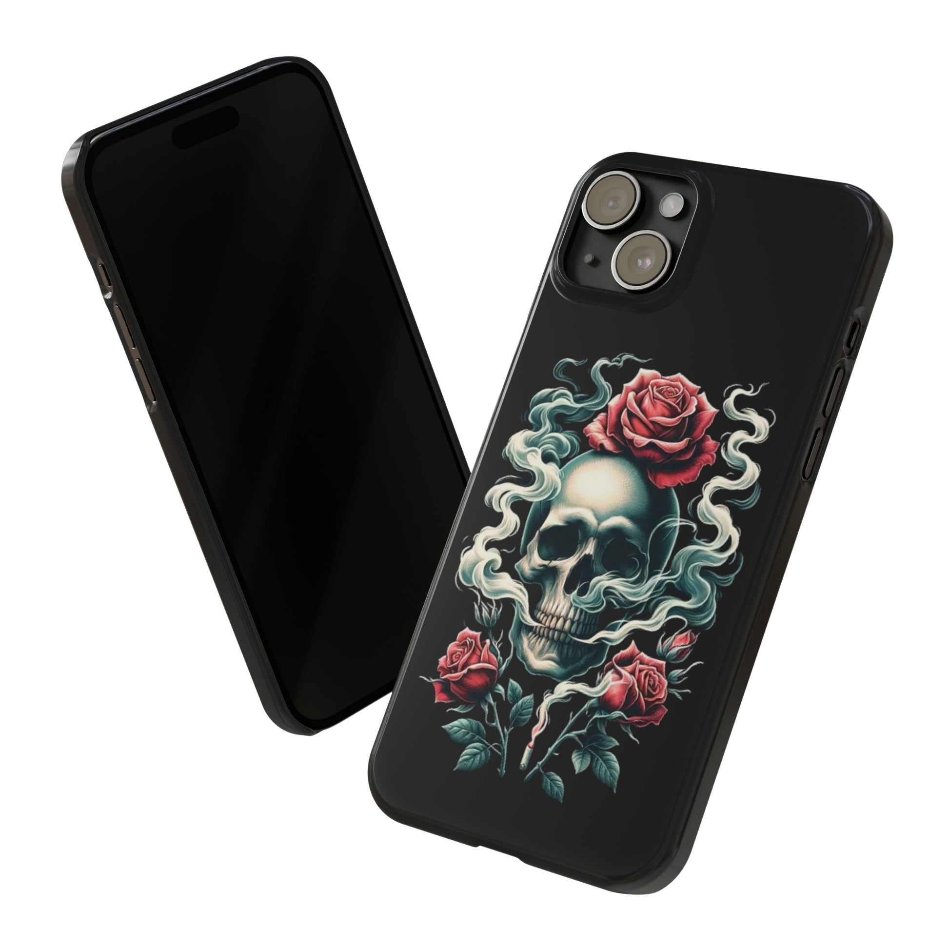Design: At the heart of this enigmatic protector lies a skeletal head, an emblem of the wisdom and mystery that bones entail. From its ears and mouth, ethereal smoke arises, wrapping your device in whispers of the unknown. Adorning this spectral centerpiece are three roses—two at the base and one crowning the head—infusing the design with a touch of life's delicate beauty amidst the ethereal smoke.