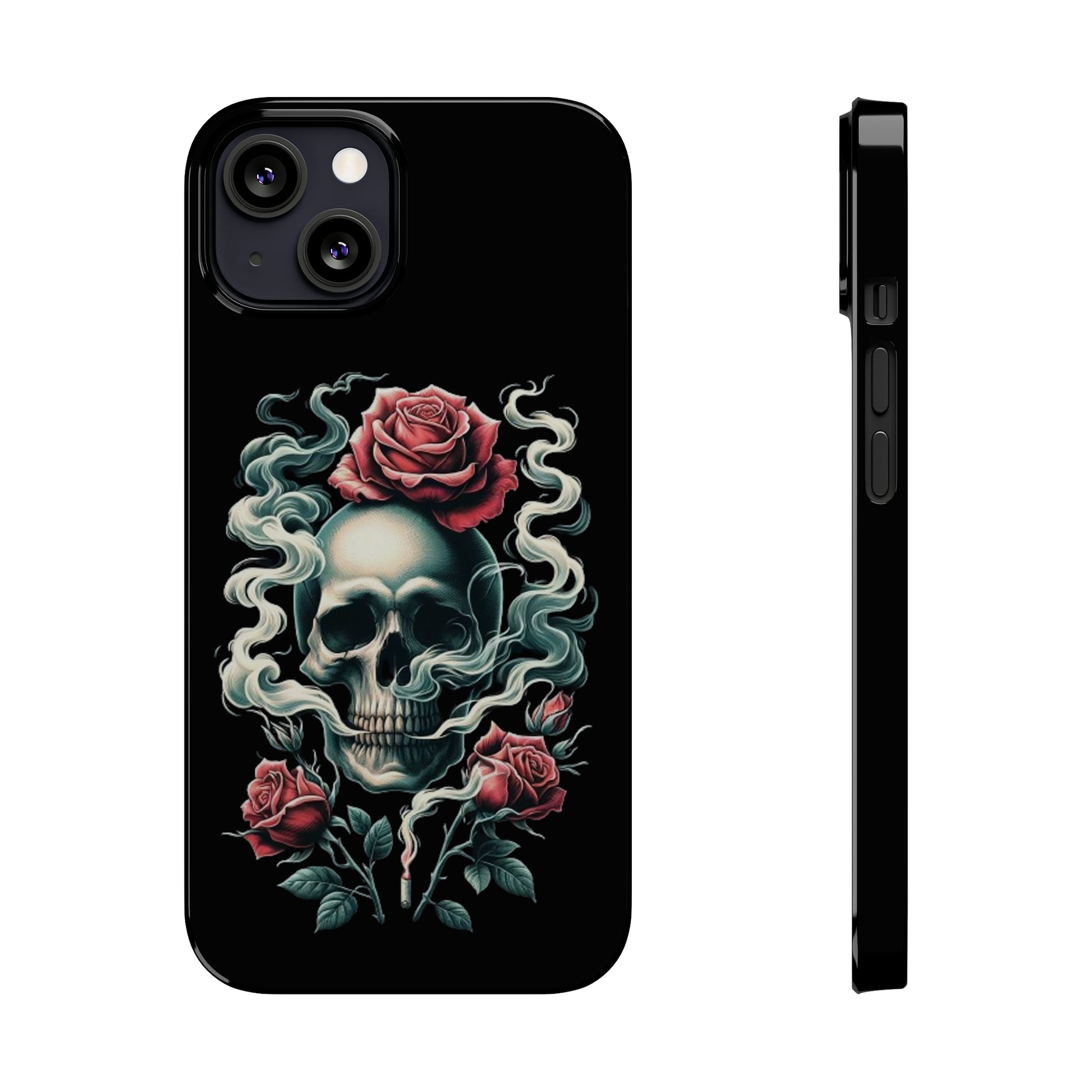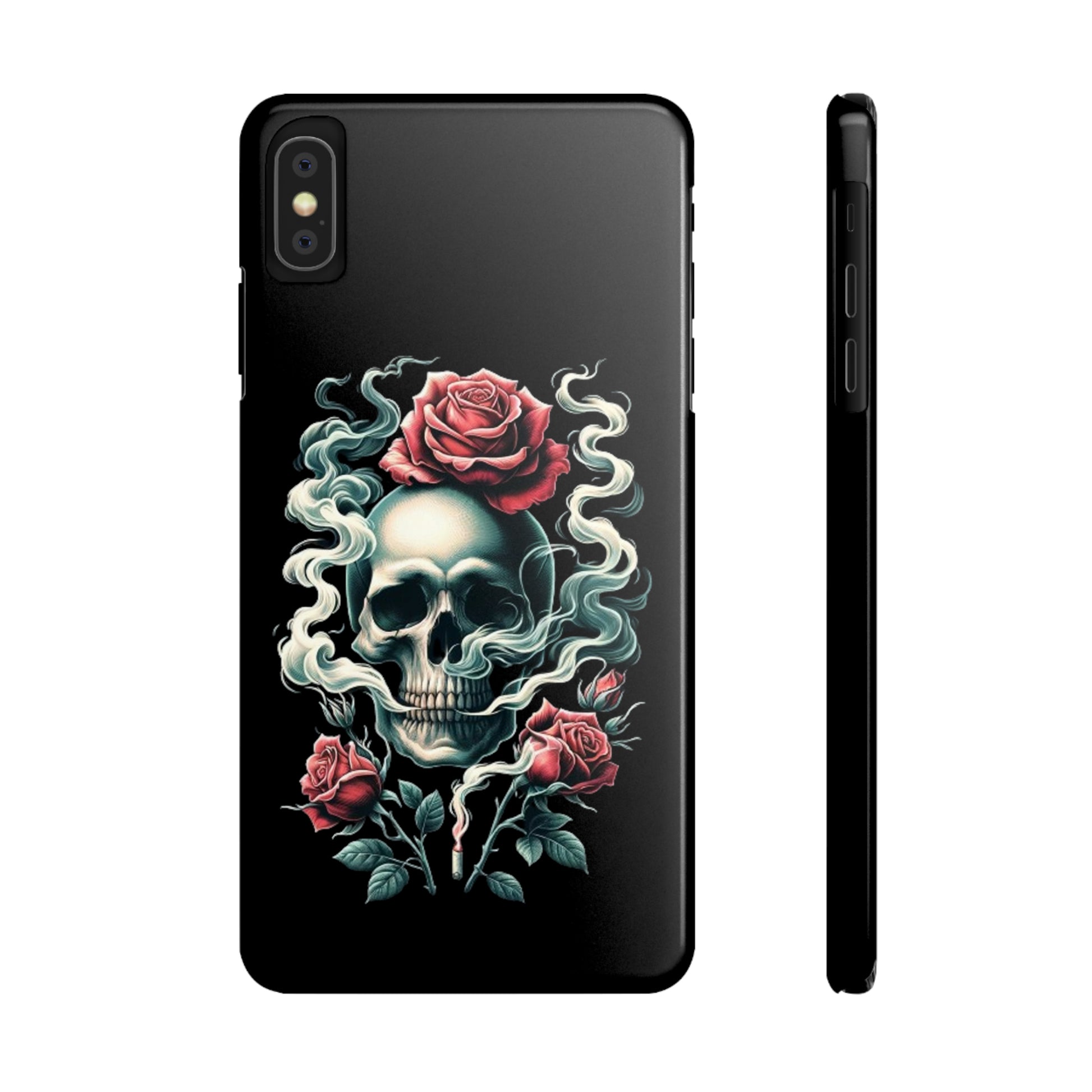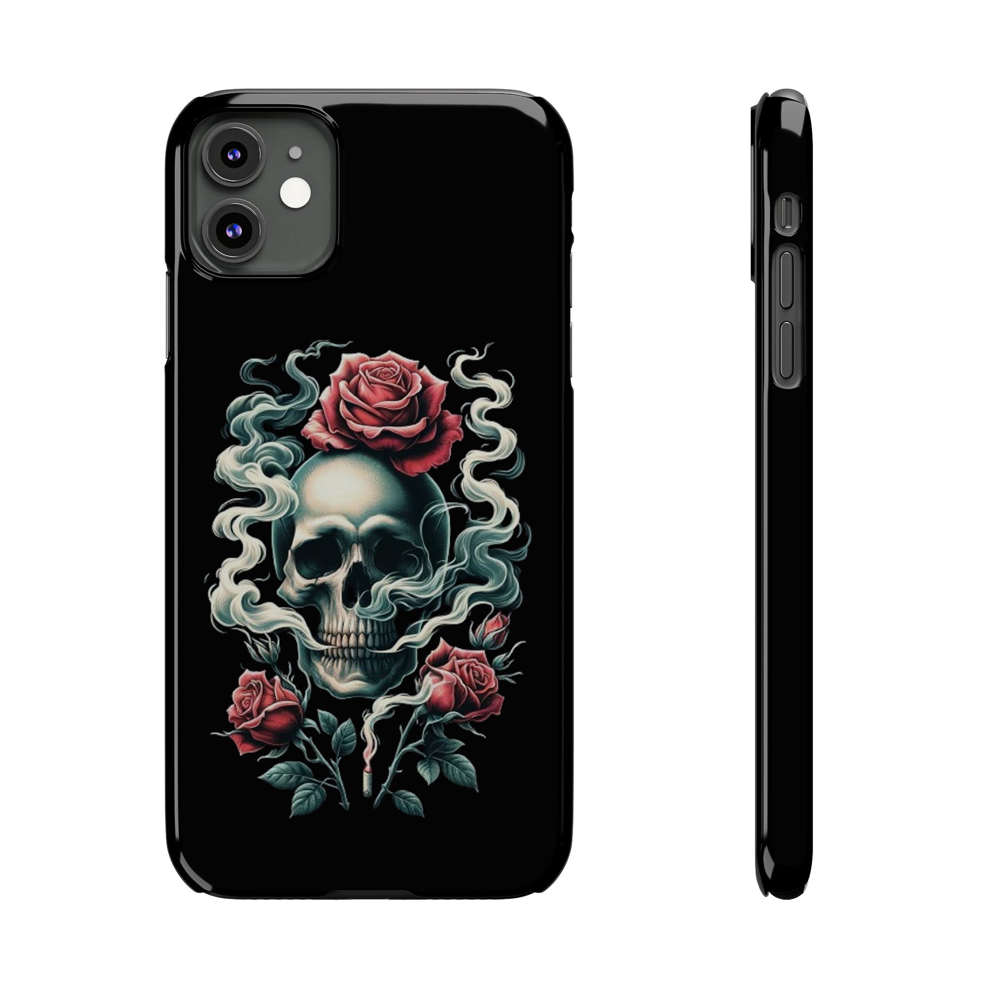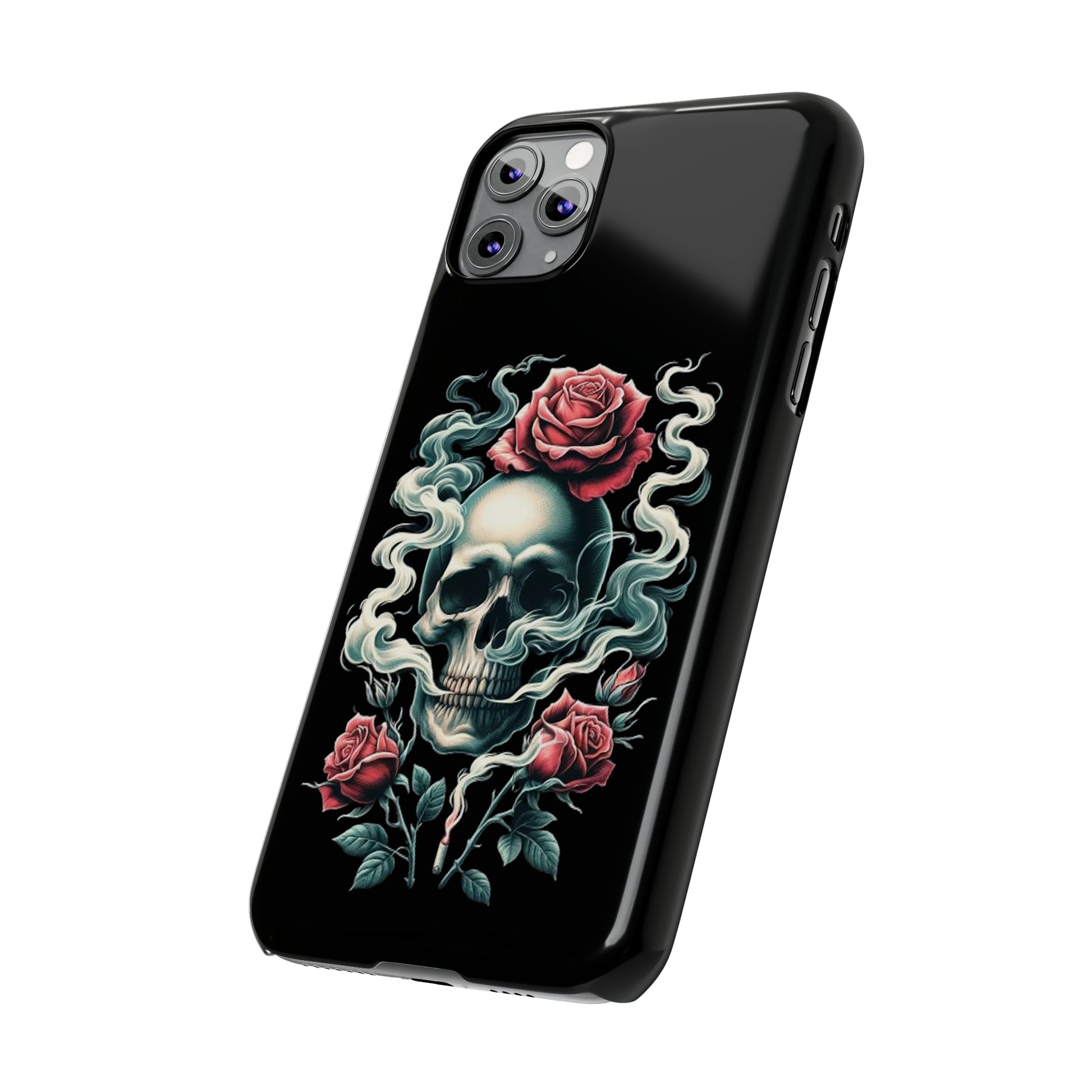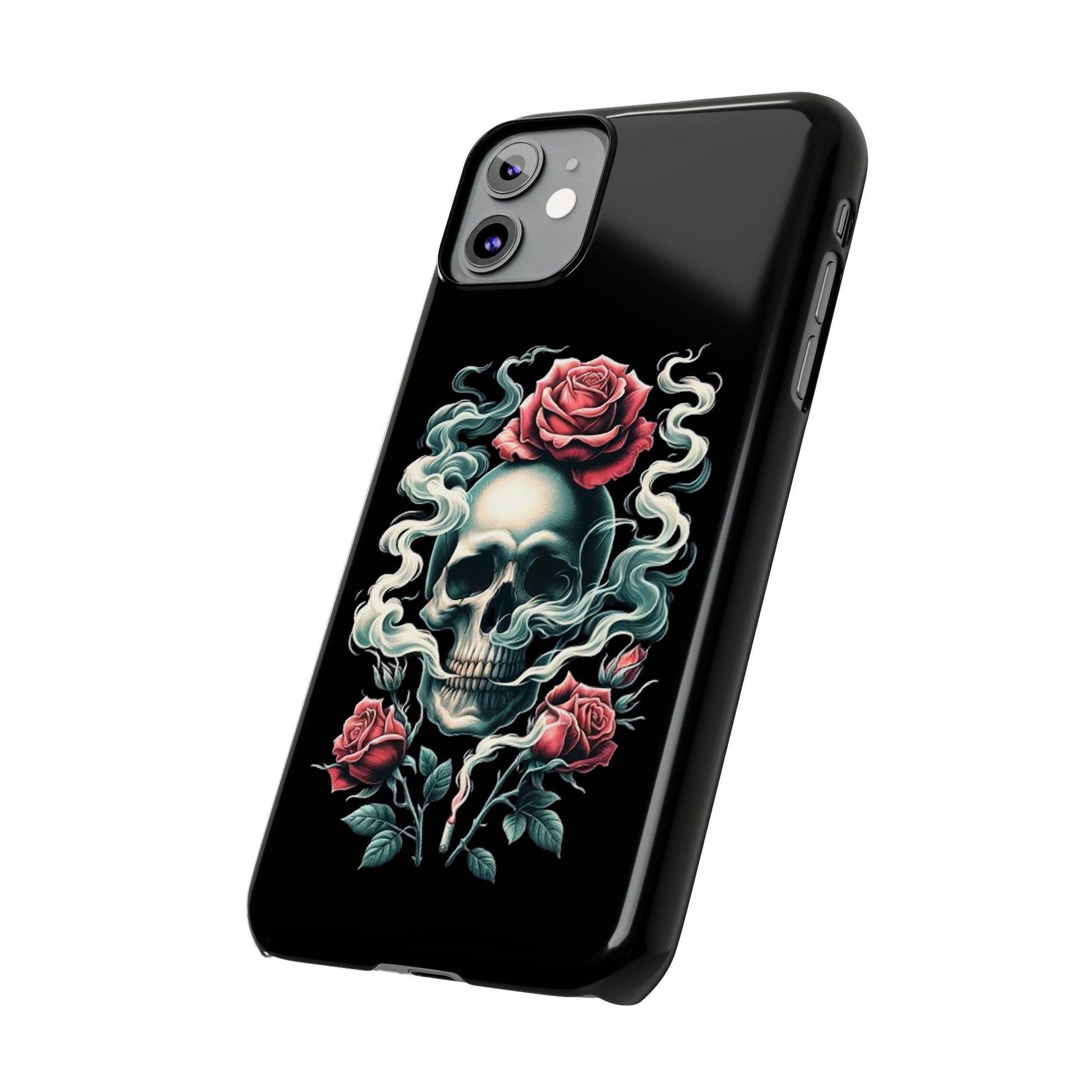 Design: At the heart of this enigmatic protector lies a skeletal head, an emblem of the wisdom and mystery that bones entail. From its ears and mouth, ethereal smoke arises, wrapping your device in whispers of the unknown. Adorning this spectral centerpiece are three roses—two at the base and one crowning the head—infusing the design with a touch of life's delicate beauty amidst the ethereal smoke.