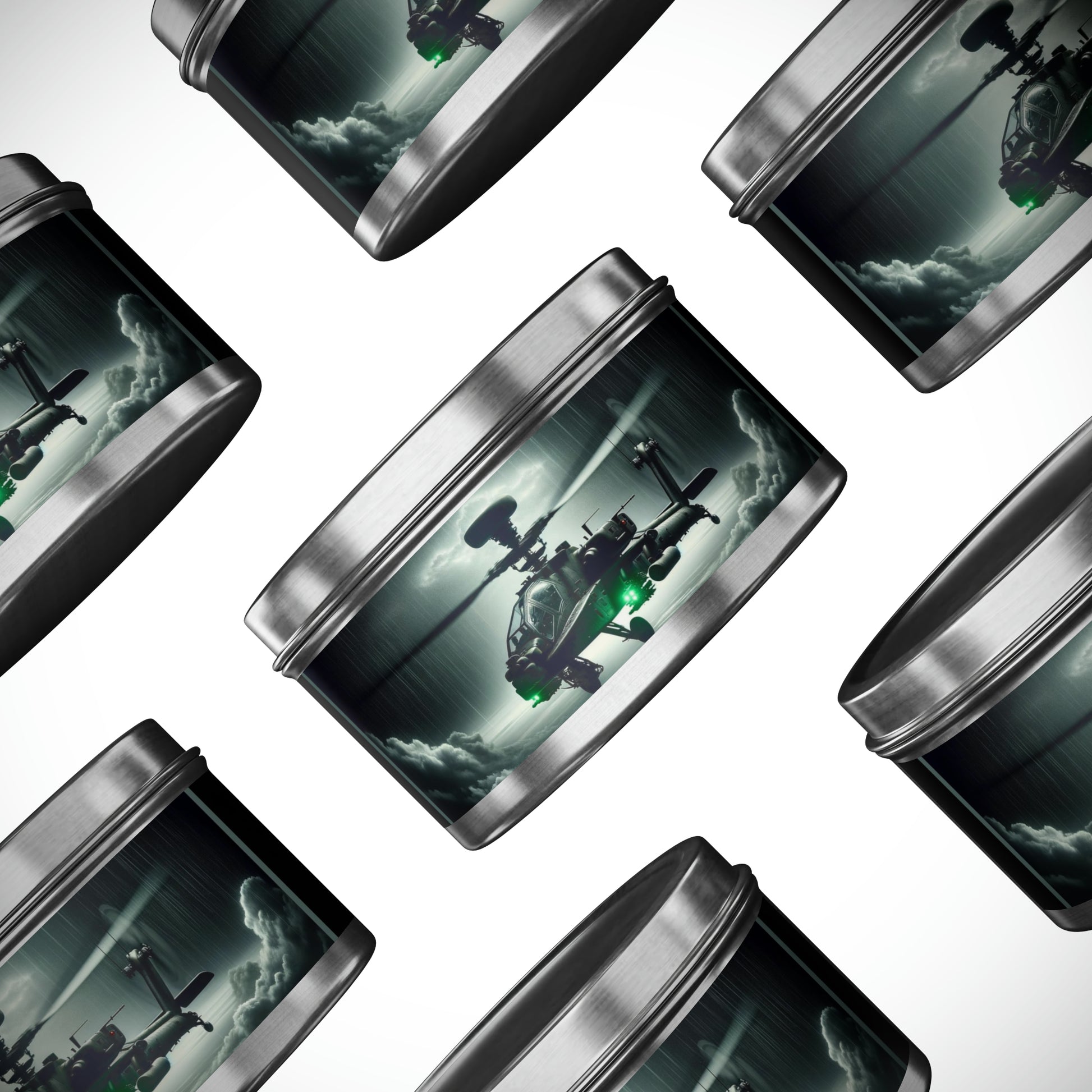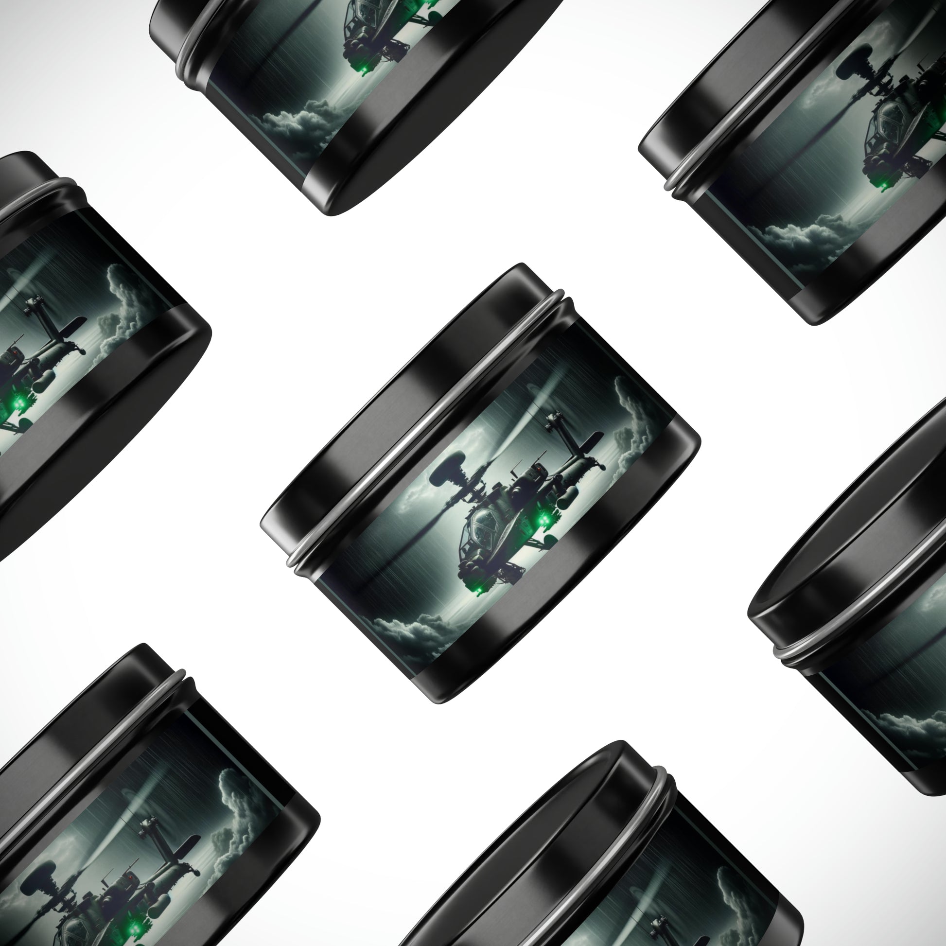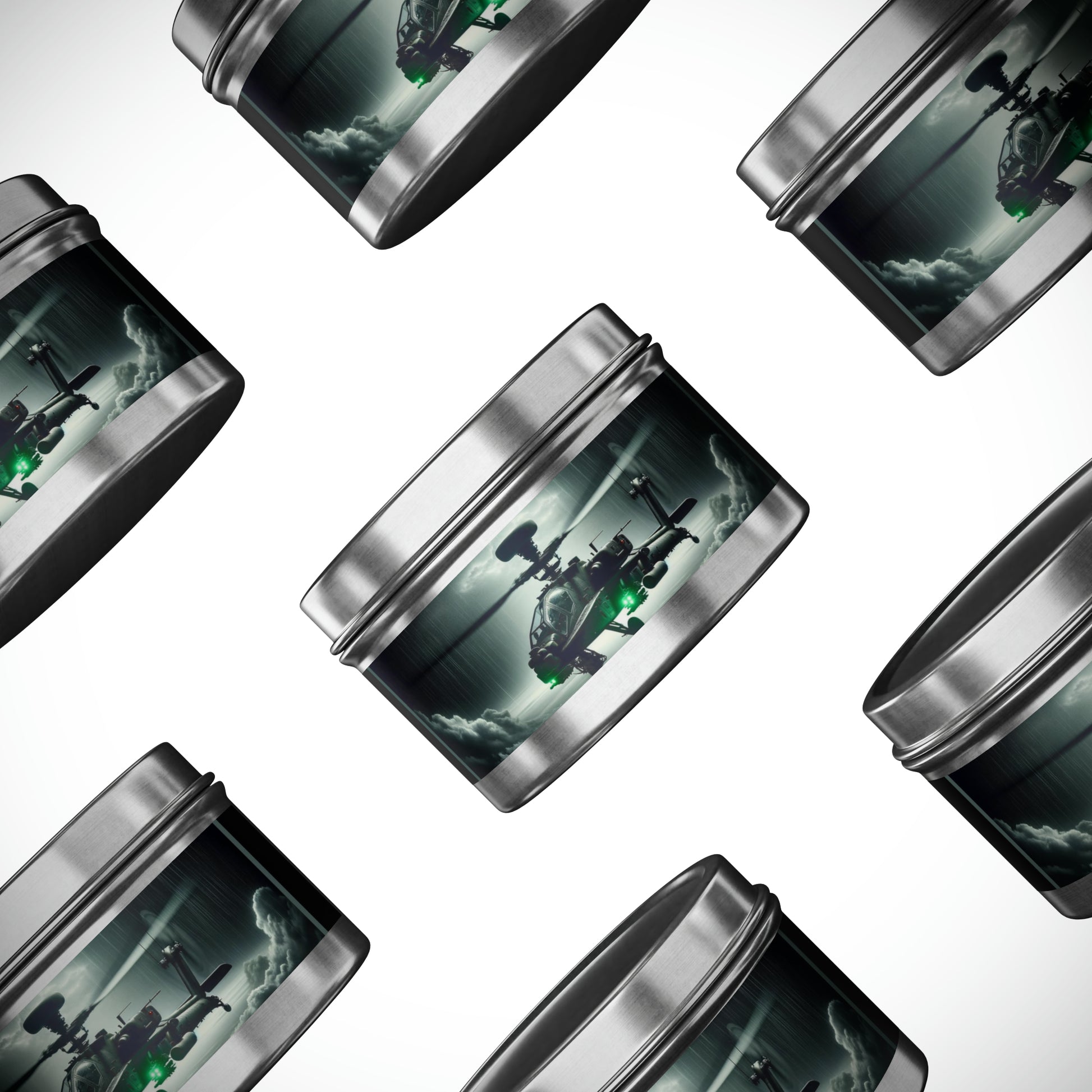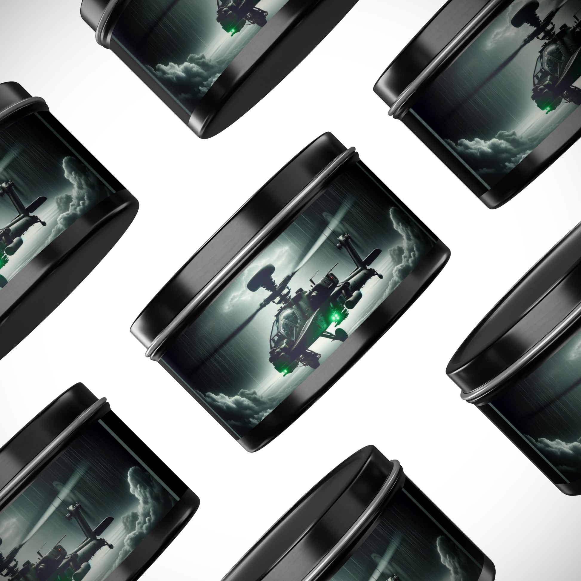 Illuminate your space with the essence of adventure - introducing our "Night Ops" Tin Candle 🕯️✨🚁! This isn't just any candle; it's a sensory journey into the heart of the night, where the brave dare to tread. Centered with a striking military helicopter design amidst clouds and a serene rain, painted in stealthy shades of black and green, this piece is a tribute to the silent, unseen heroes of the night.