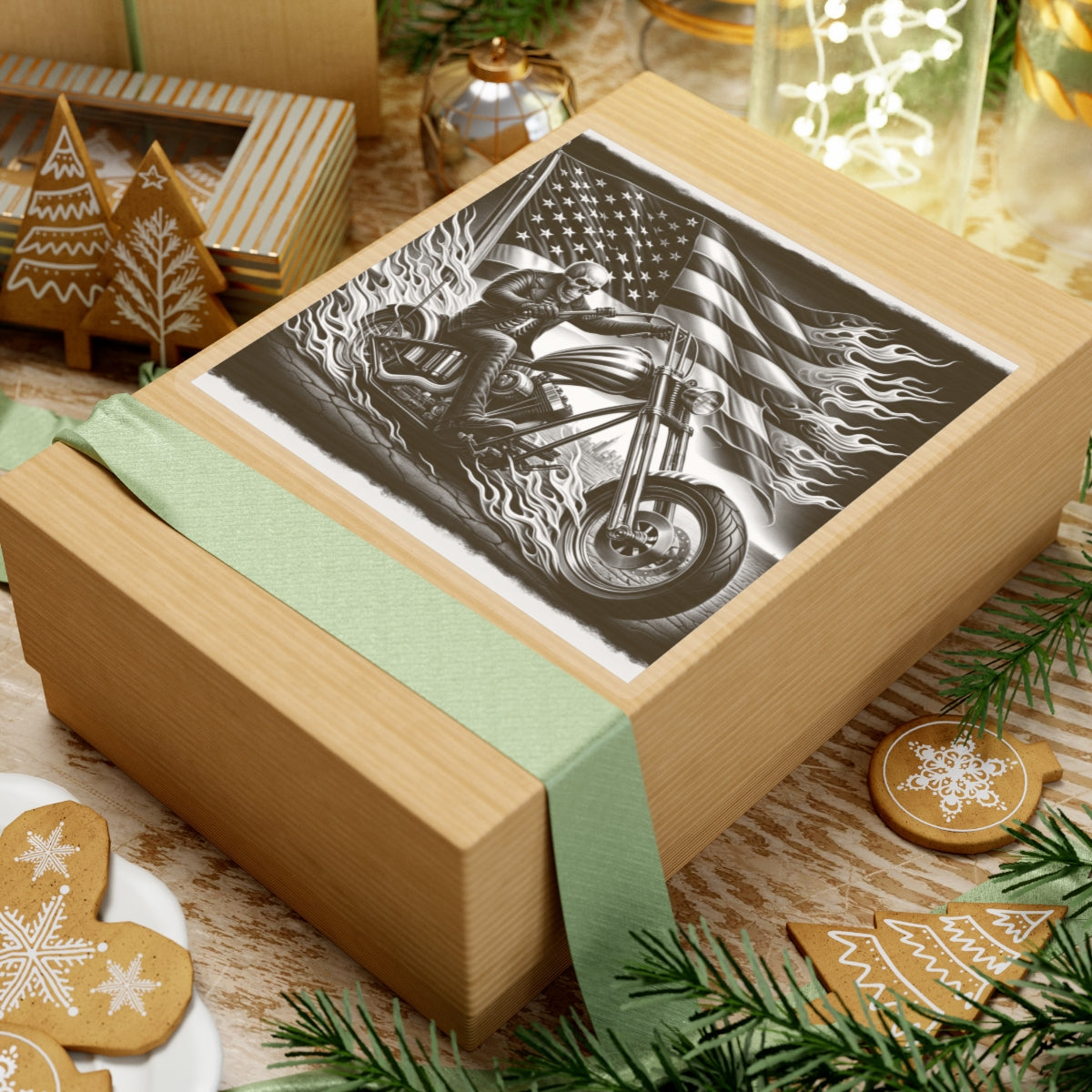 Your eyes are instantly drawn to the resolute American flag that forms the backdrop, stars and stripes painted with bravado and reverence. Juxtaposed against Old Glory is the stark silhouette of a chopper, its skeletal rider in defiant pose, a spectral figure embodying the everlasting pursuit of liberty.