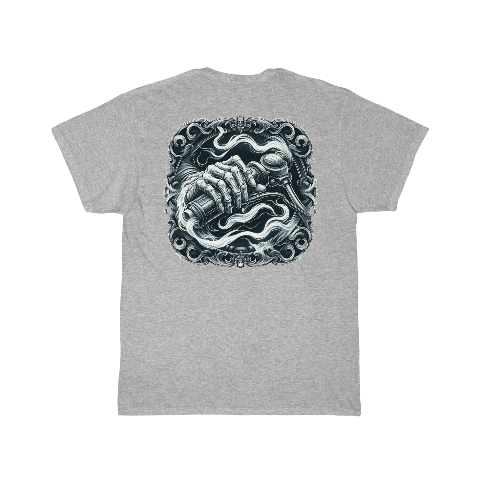 Feel the Heat of Design: Grasping at the core of the tee is a bold skeleton hand, locked tight around a motorcycle handle, symbolizing the unyielding bond between rider and machine. It's a salute to the adventurous souls who grip the throttle of life with no intent to let go.