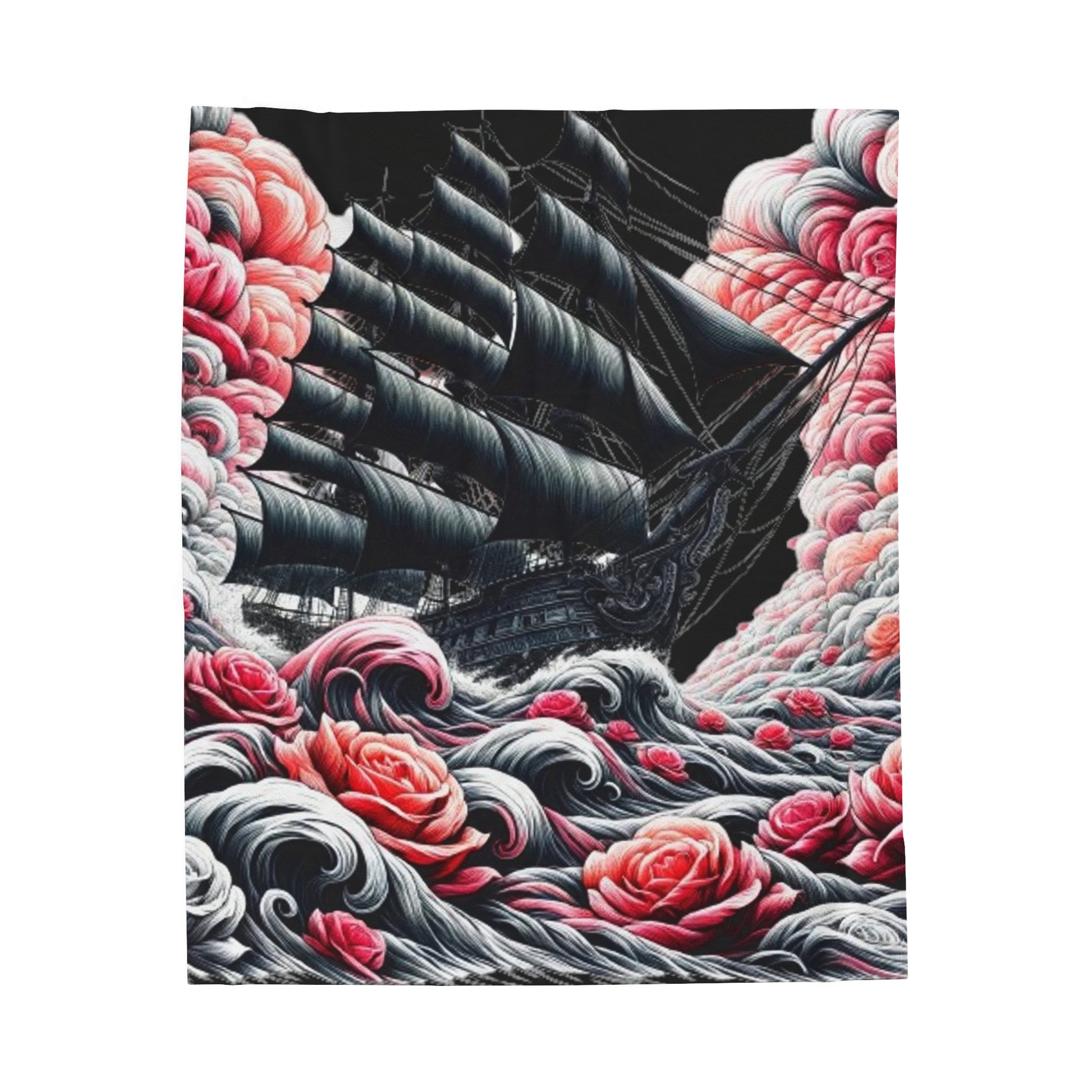 Design: The centerpiece of our "Sail into the Bloom" blanket features a majestic black ship, navigating through the tempestuous waves of life's challenges. But these are no ordinary waves - they burst forth in vibrant hues of pink, coral, and grey, symbolizing hope, love, and balance amidst the tumult. The rich colors and dynamic imagery serve as a reminder that beauty can always be found, even in the roughest seas.