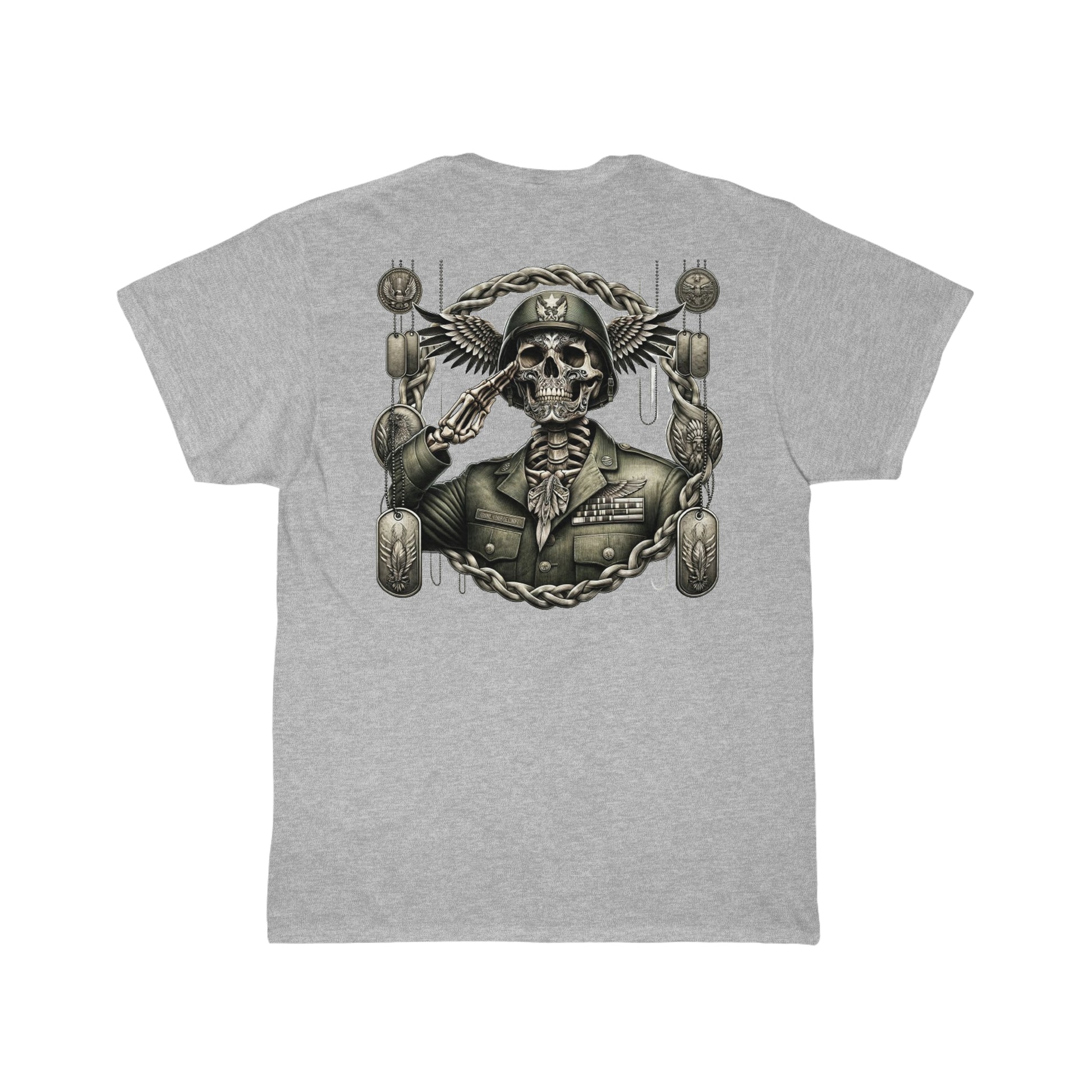 Centrally placed on the shirt is a staunch skeleton, garbed in the finest details of a military uniform – each medal, each badge, each crease rendered with a realism that speaks to the gravity and dignity of the calling. The skeleton stands at attention, offering a salute that transcends time, a powerful representation of the respect and reverence for the service and sacrifice of military personnel.