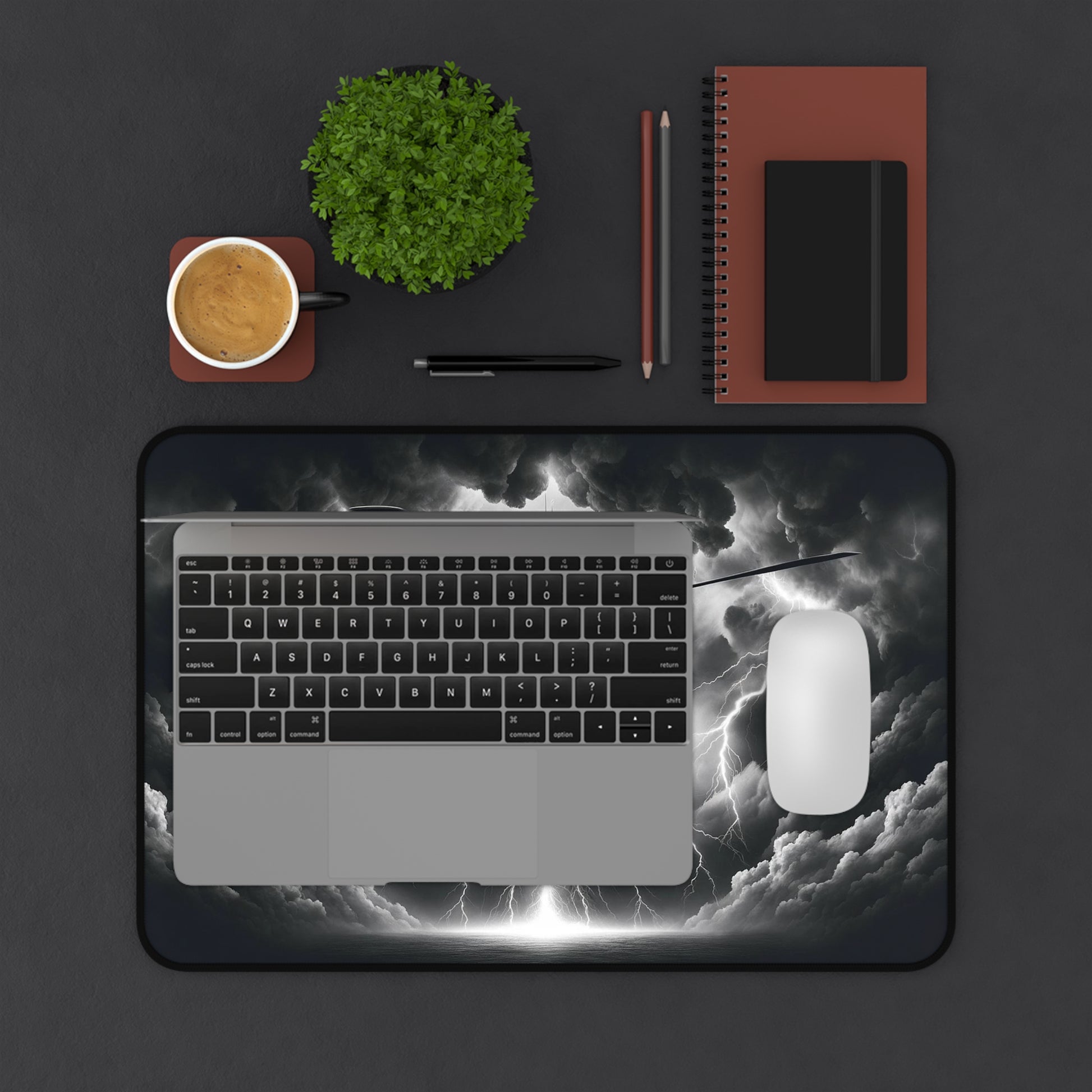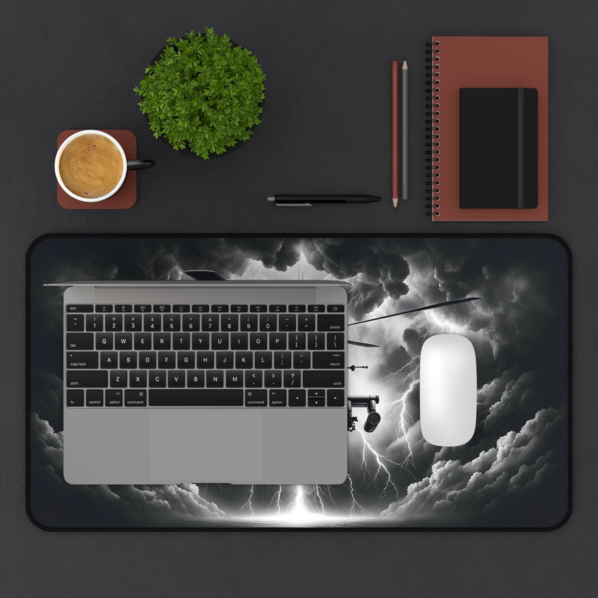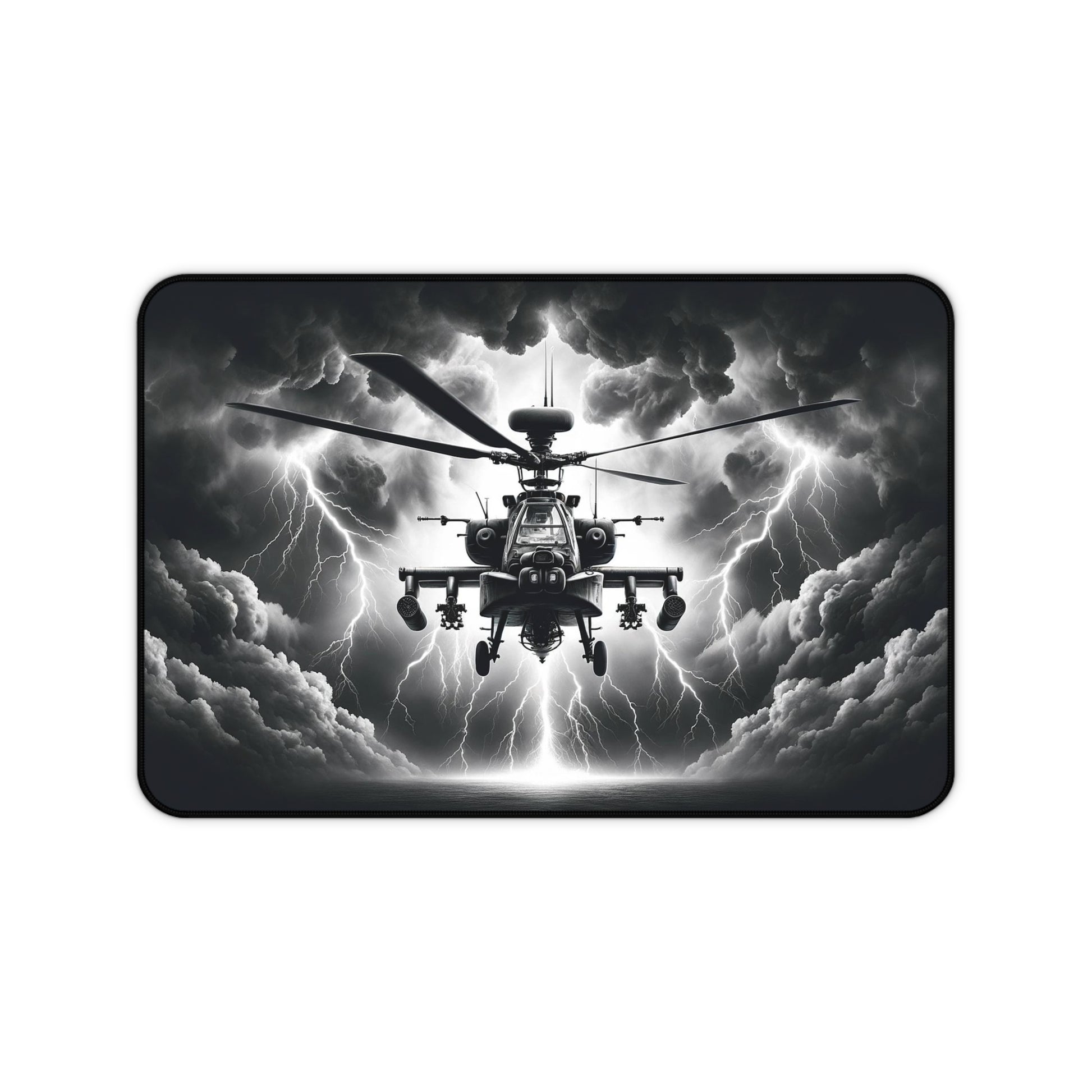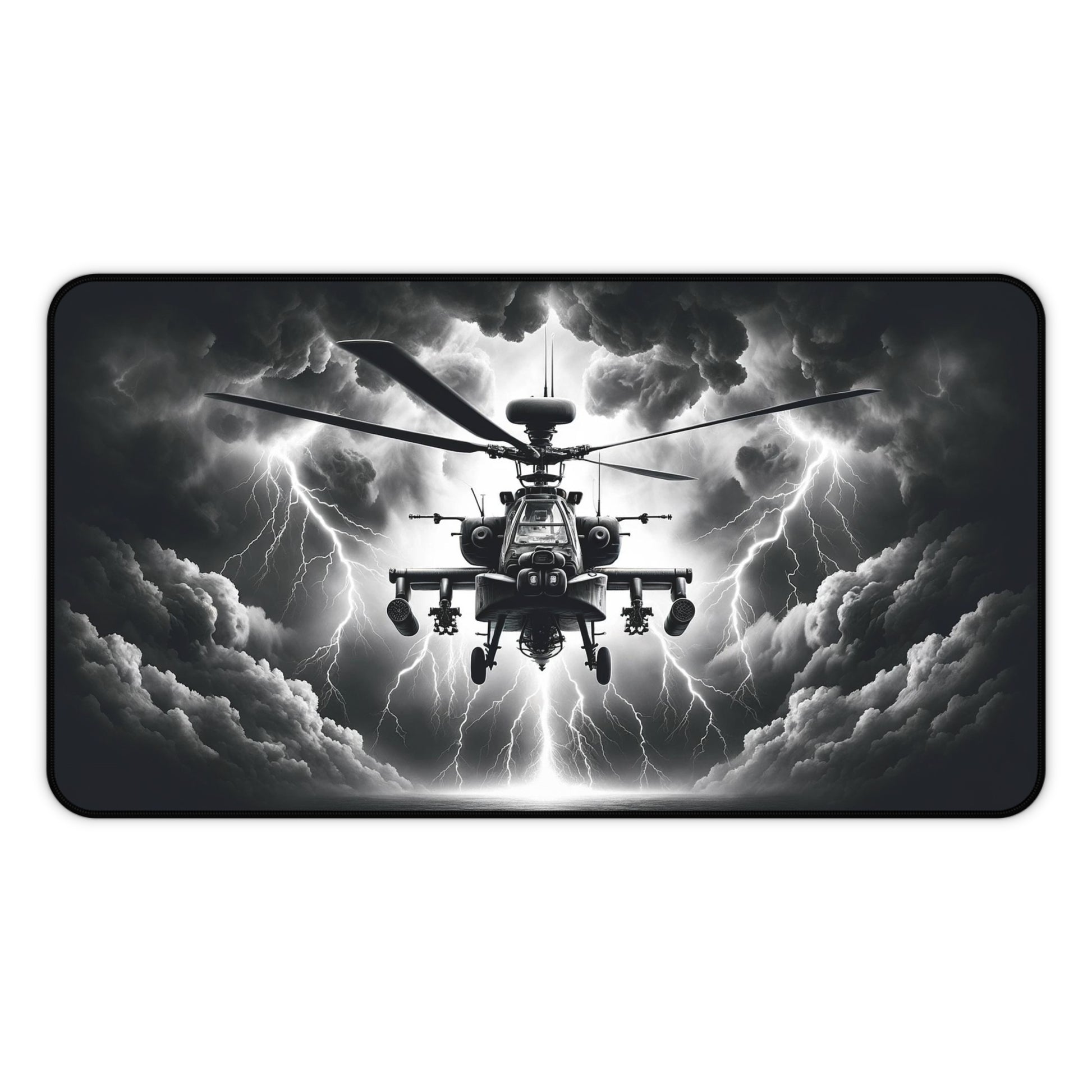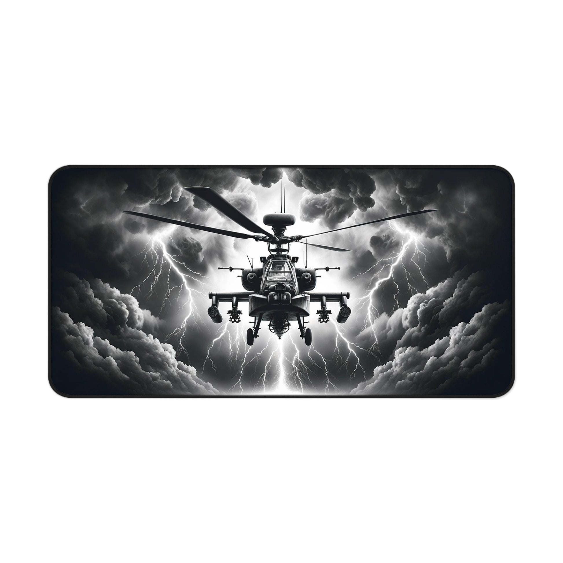 Imagine the powerful silhouette of a large military chopper, center stage on your desk, encapsulated by the swirling tempest of dark storm clouds and the electric dance of lightning bolts. This isn't just a desk mat; it's a statement piece that brings the dramatic intensity of a black and white aerial storm right to your workspace.