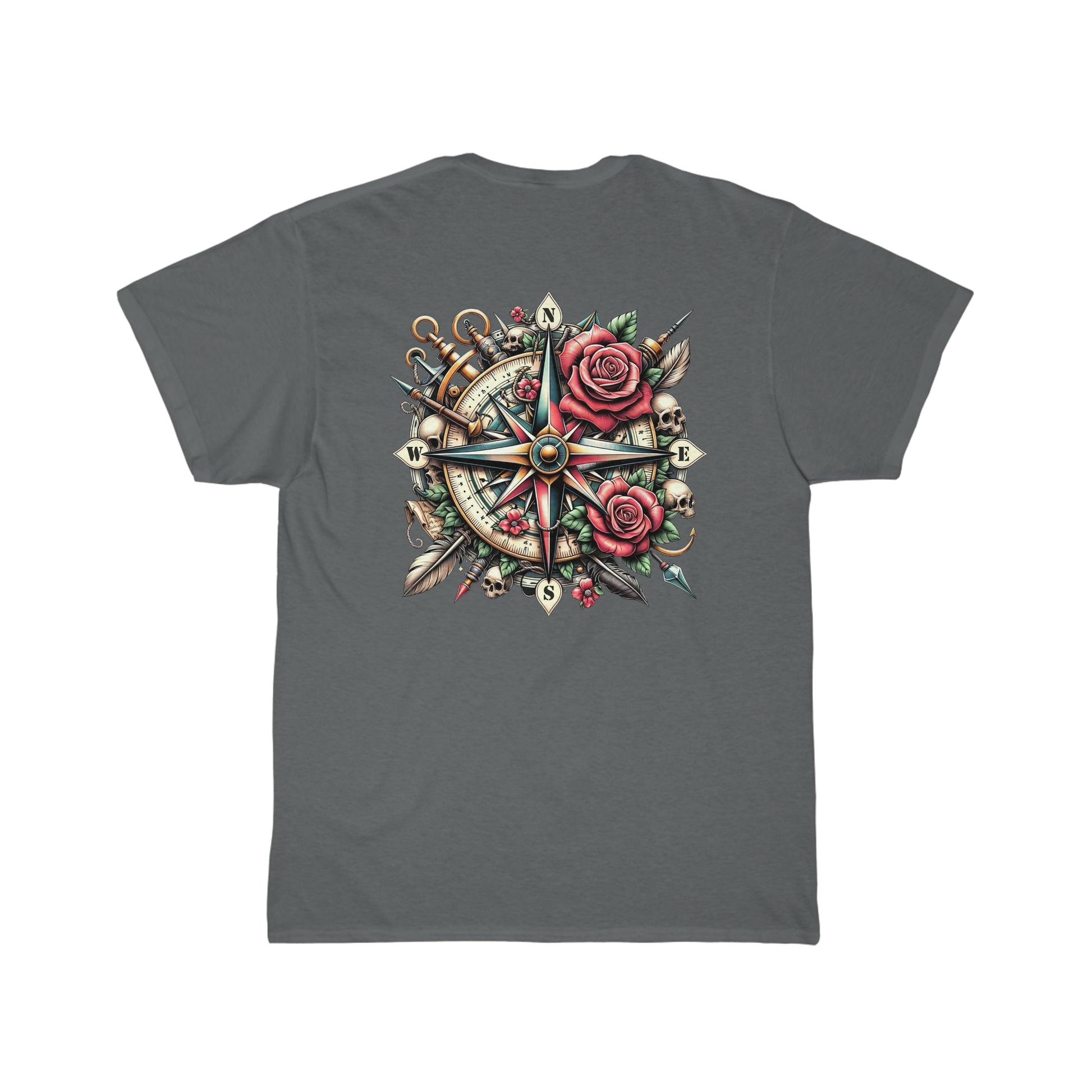 Centered on this soft, comfortable tee is a beautifully detailed compass, its arms stretched out towards the unknown. Between the north and east, as well as the east and south arms, vibrant red roses bloom with passion and mystery, their petals a bold contrast against the intricate metallic design of the compass. 🌿🥀
